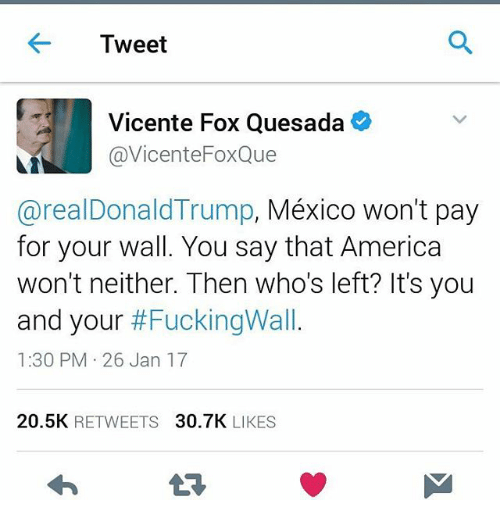 Fox hasn’t minced his words about President Donald Trump’s proposed U.S.-Mexico border wall since a 2016 interview in which he publicly declared that Mexico is “not going to pay for that fucking wall.” The outspoken Trump critic has since famously trolled the U.S. president on Twitter (@vicentefoxque) with the hashtag #FuckingWall.