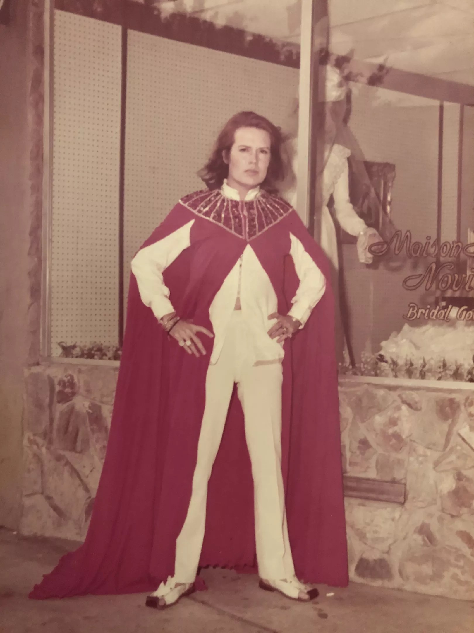 According to my pops, Mercado was flown to Miami by Chin Martinez, who planned to present Mercado with the Chin de Plata. As my dad told it, he was tasked with picking up Mercado at the airport and photographing him around town. There’s one photo of Mercado getting a blow-dry at a hair salon. In another, Mercado strikes a serious pose outside of what appears to be a bridal store. Wearing one of his signature capes, with his hands on his hips, he gazes at the camera.