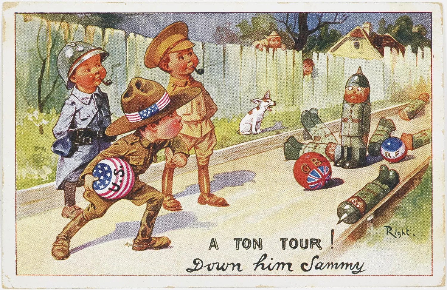 Some of the selections are more shocking than others. An entire display case, for example, is dedicated to propaganda for children, including paper dolls of fleeing French soldiers and Nursery Rhymes for Fighting Times.