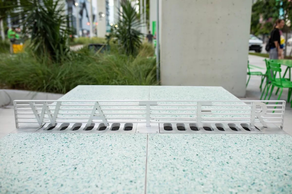 Underneath Miami’s Metrorail tracks in Brickell sit two distinctive Ping-Pong tables. The tables look almost like inverted pyramids made of concrete. Here, the typical mesh net that divides the table is made of metal and spells out the word “water” on one and “table” on the other. As you walk by them, you can almost imagine the tables calling out to you to come and play.