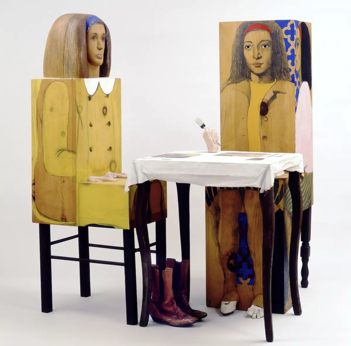 Sirmans notes that Marisol was an established artist who studied with the German abstract painter Hans Hofmann. Her education and life experiences allowed her to view the world differently and create bold figurative works using bold materials like wood.