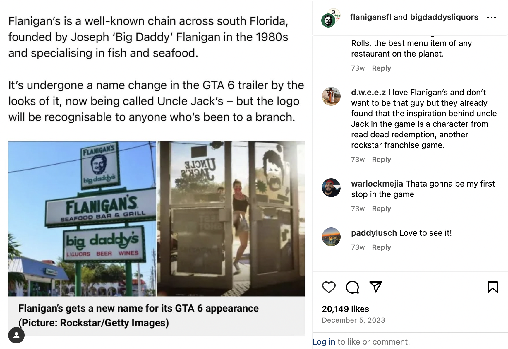 Eagle-eyed fans (and proud locals) spotted what looks unmistakably like a Flanigan’s storefront nestled into the game’s fictionalized version of Miami, known in the GTA universe as “Vice City.”
