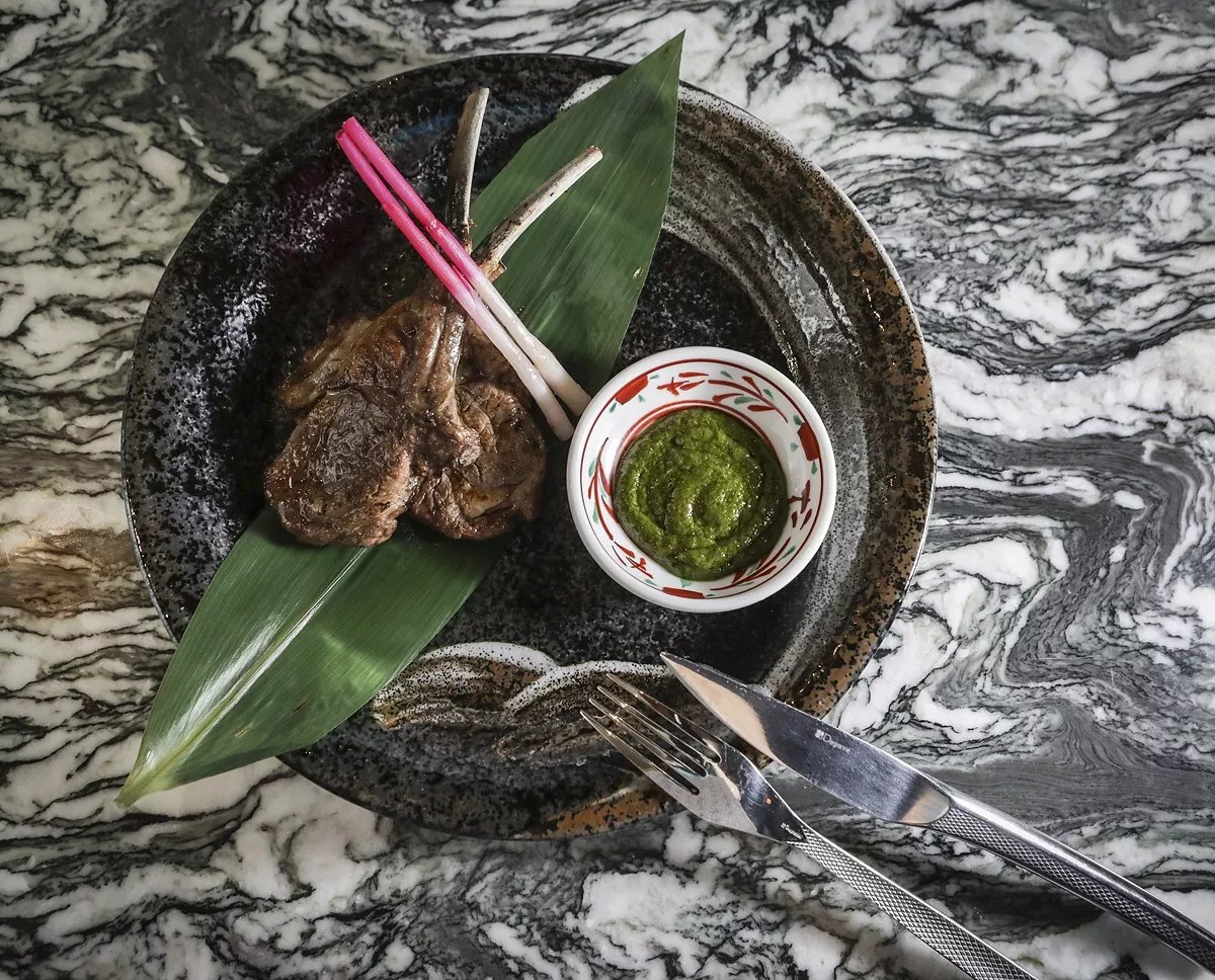 The restaurant also offers filet mignon and a porterhouse, priced at $80 and $130, respectively. Both come seasoned with truffle salt and ponzu and are grilled on the robata, which sears the meat and creates a crisp, smoky crust.