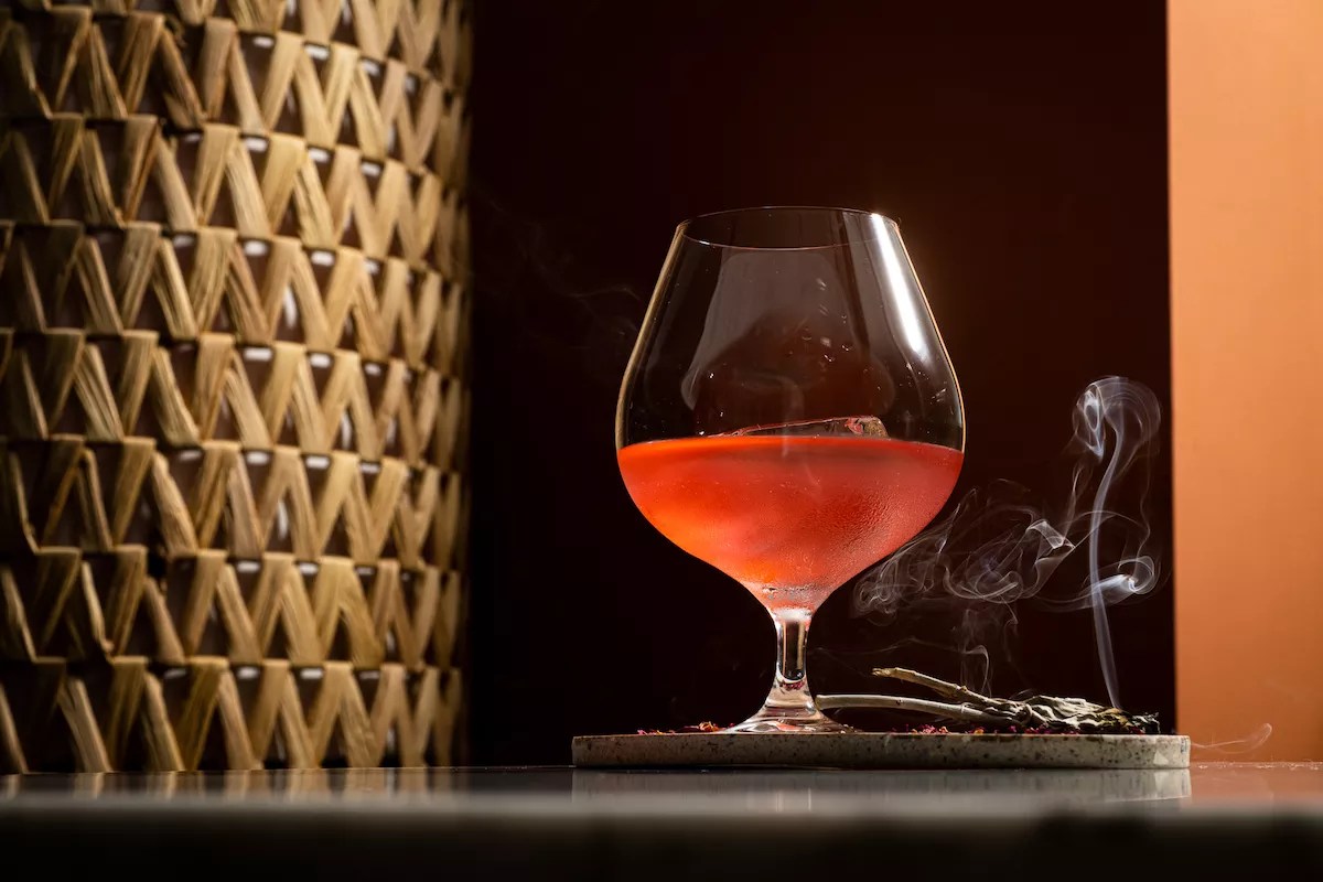 The heady combination of Aberfeldy scotch whisky, fino sherry, strawberry, and raspberry is married with gentle notes of steeped rose tea, sage, and cacao and a touch of citrus to pull the tannins and clarify the liquid. It’s poured into a goblet-sized glass with a single cube, served on a wooden board with dried rose petals and smudged, smoking sage.