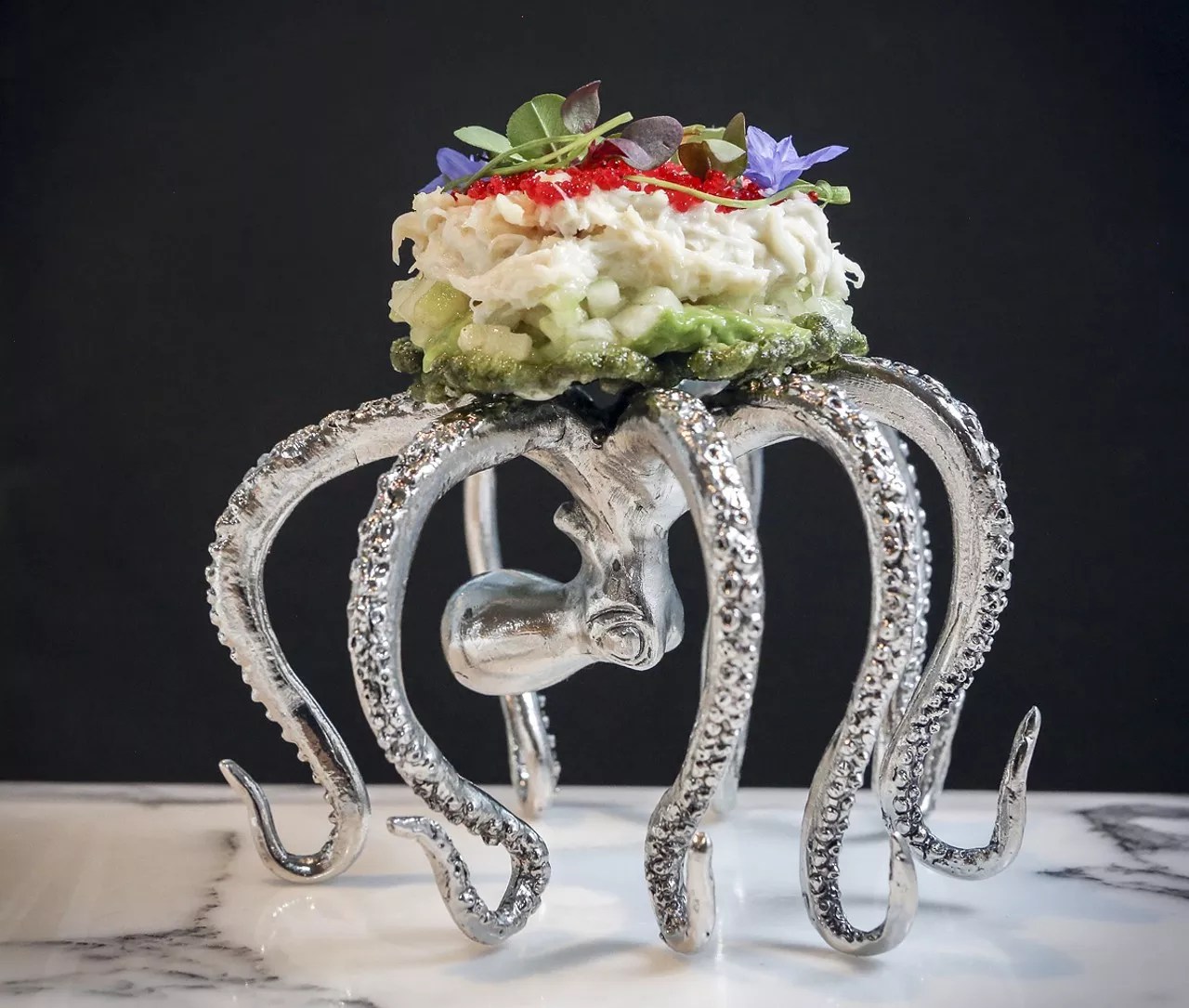 The California funnel cake is the quintessential example of Bazaar Mar’s whimsy: A seaweed “funnel cake” base is topped with blue crab, avocado, tobiko (flying fish roe), cucumber, and mayo. It’s among the options served for Spice dinner.