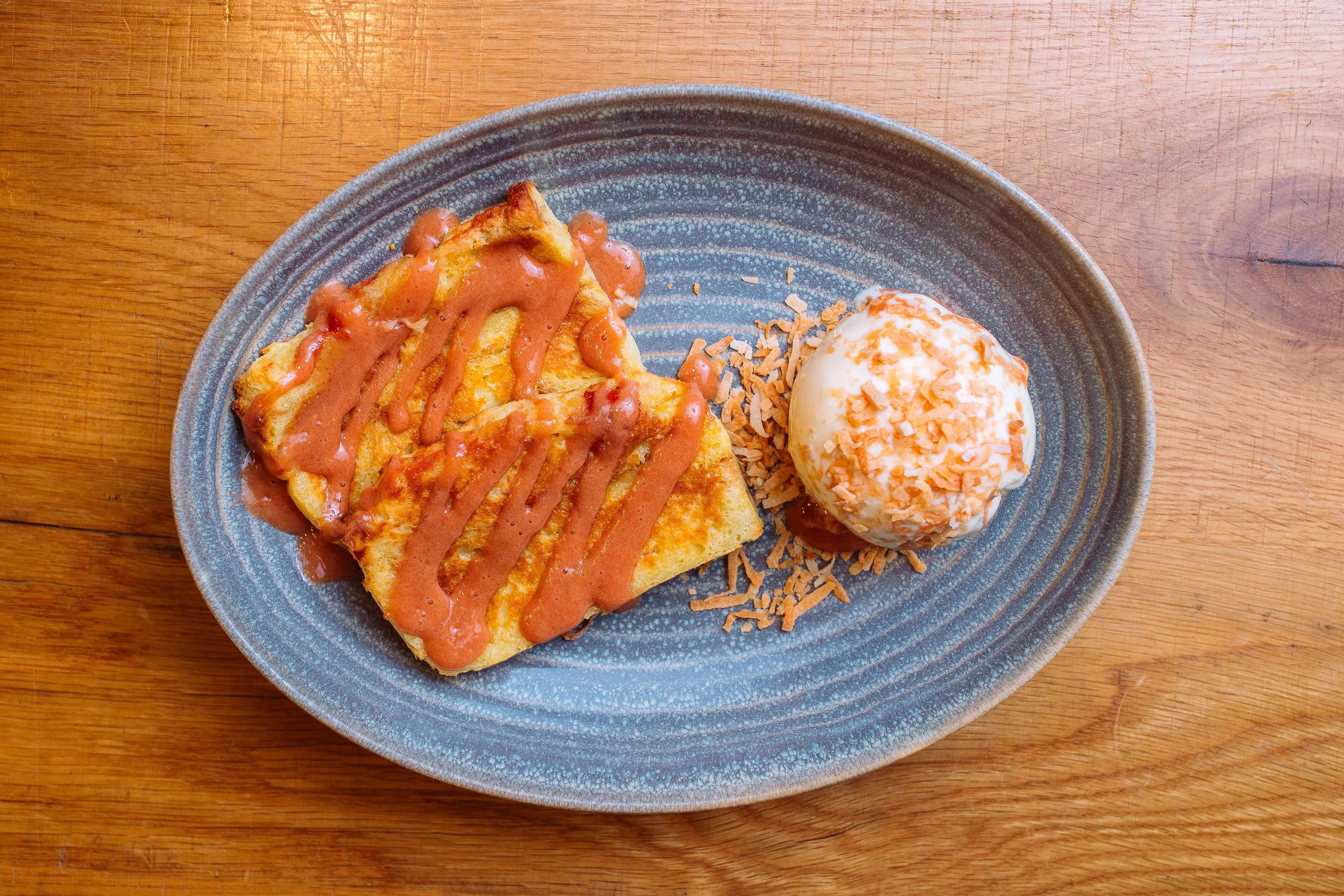 The brown butter, white chocolate tres leches croissant bread pudding with vanilla soft serve at Cracked by Chef Adriane