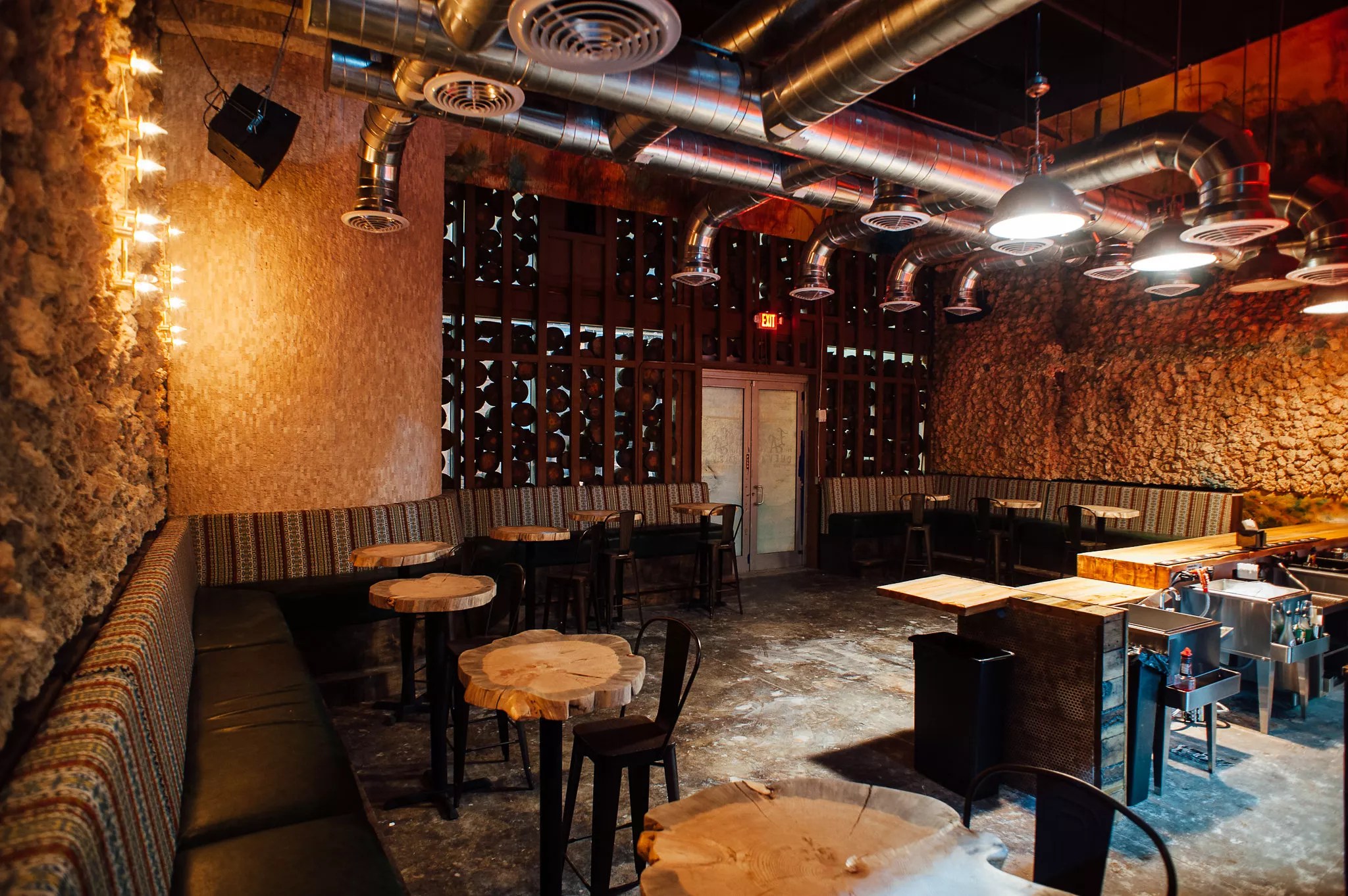 The interior is lined with tree logs from the Yucatán Peninsula, tabletops made of cross sections of natural Mexican royal ebony from the city of Oaxaca, and a bar made of trees toppled by Hurricane Andrew.