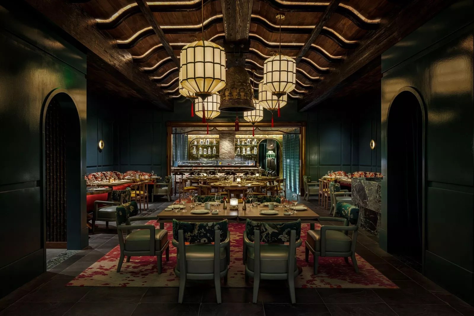 At its core is the crane, a symbol of luck and elegance, featured across tiled mosaics, embroidered fabrics, and custom wallpaper. Inside, a gold-leaf ceiling crowns a private dining room lined with antique woodblock prints and vintage Japanese artwork. Outside, a towering pagoda anchors a mural-lined courtyard shaded by palms.