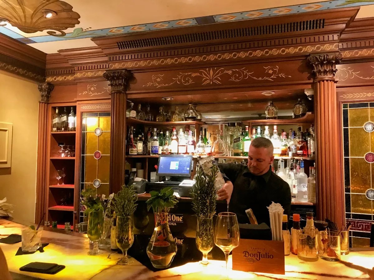 The Onyx Bar is the only major addition. In Versace’s time, the kitchen occupied this space. Now the stoves have been moved to a former garage, and a bar with stained-glass accents takes their place. The main attraction at the bar: a 24-karat golden margarita festooned with real gold flakes.