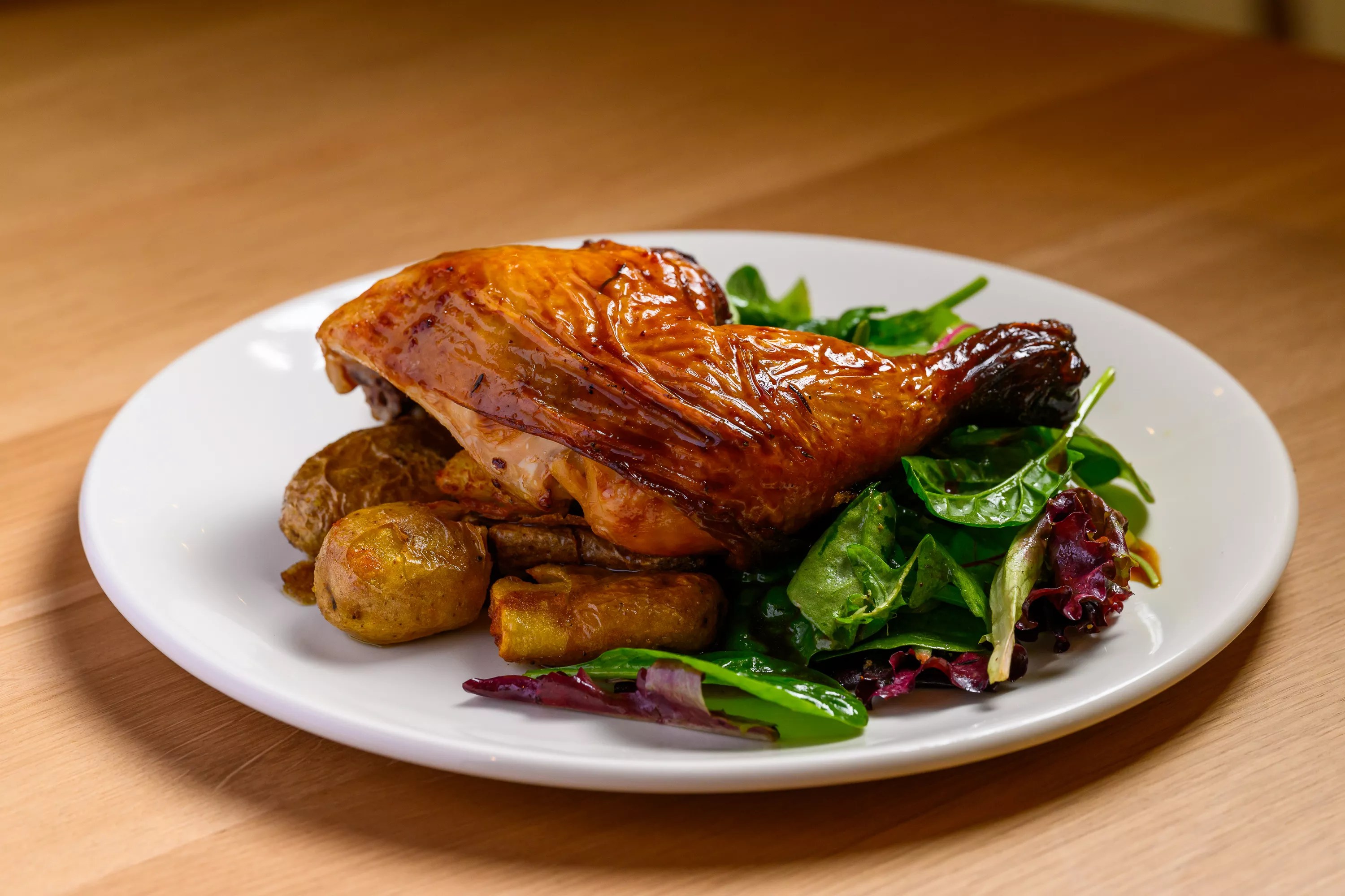 The rotisserie chicken undergoes a three-day preparation of brining, drying, and cooking.
