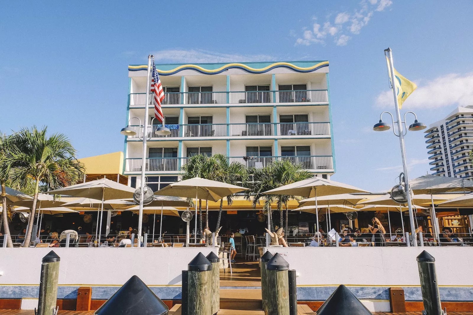 Lido Bayside Grill offers a pool deck overlooking the bay and docked boats nearby.
