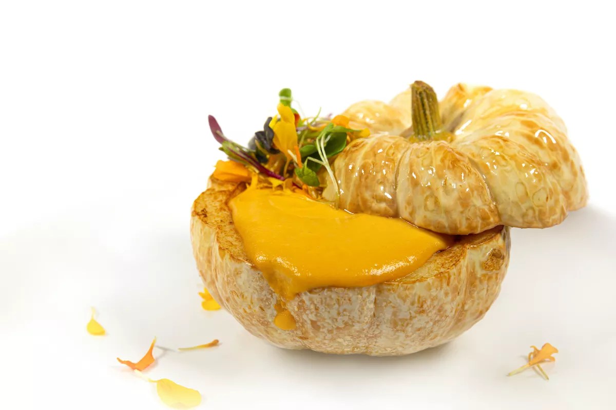 Chef Adrianne Calvo’s eponymous eatery is featuring a whipped pumpkin spice bisque this season. Her rendition of the creamy vegetarian soup blends roasted pumpkin, olive oil, honey, and pumpkin spice seasoning. A pinch of kosher salt and black pepper brings out the squash’s deep, earthy flavor ($11). “Pumpkin is the perfect addition to a bisque as it gives it an incredibly velvety texture, an earthy, sweet flavor, and that beautiful orange color,” Calvo says. “It’s also the matriarch of the season, so we tried to pay homage to the ingredient in a delicate yet strong way.”