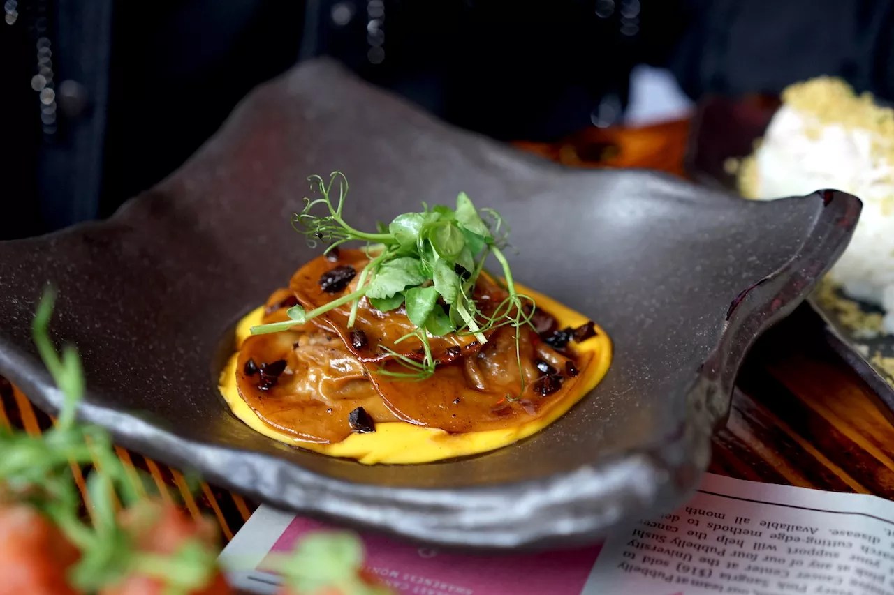 Tanuki’s special pumpkin creation is a fried dim sum dumpling, the “Cinderella Beef Puff.” The starter combines Wagyu beef, pumpkin, scallions, and dehydrated lychee. Pumpkin adds silkiness and subtle flavor for a textural contrast ($12).