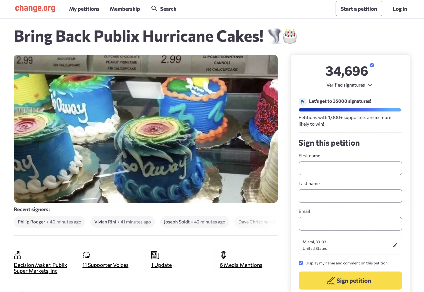 The Change.org petition to bring back the Publix hurricane cakes has nearly 35,000 signatures as of Friday, August 12, at noon.