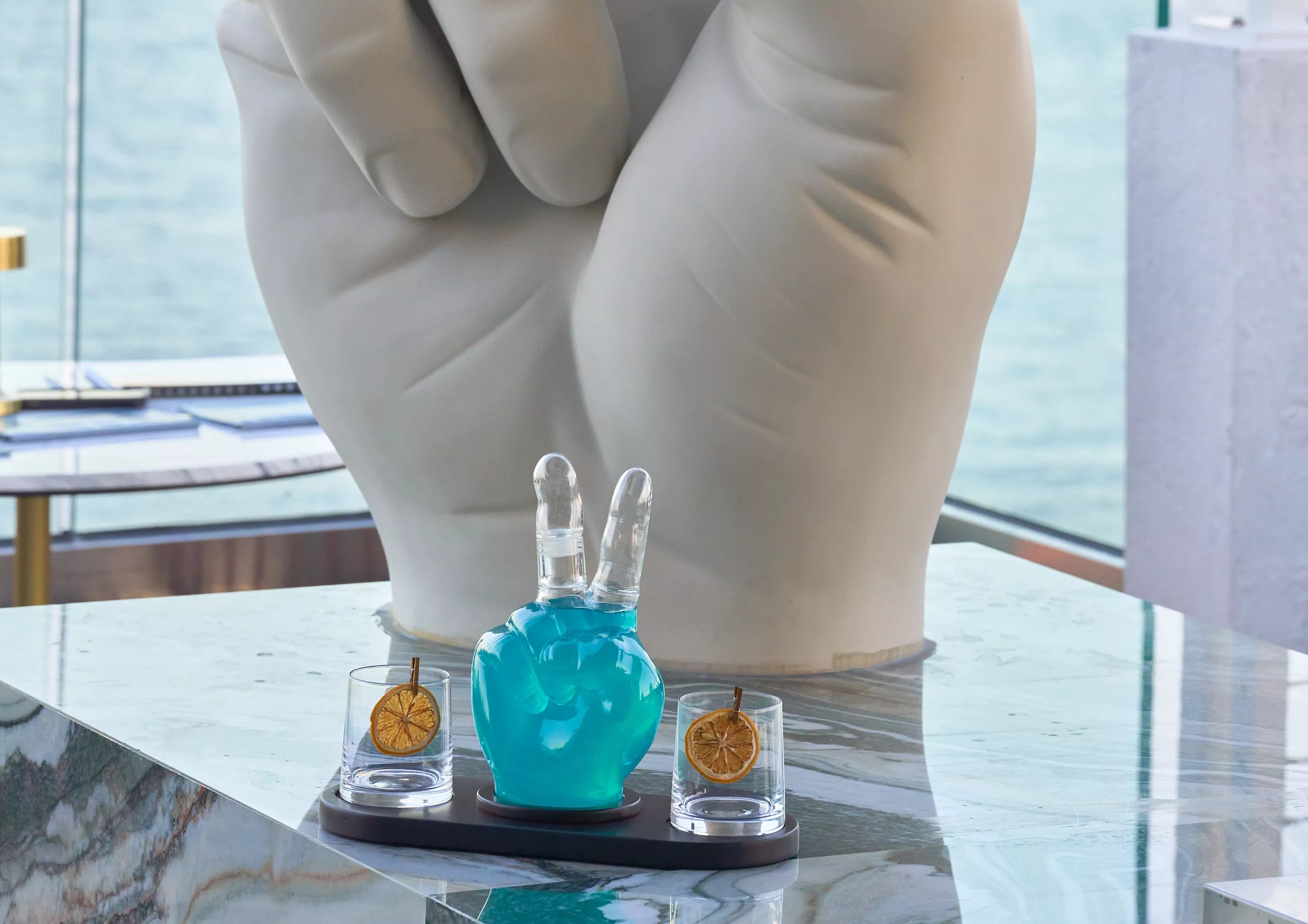 Nubé encompasses 4,500 square feet of indoor and outdoor lounge and bar seating, plus a wraparound balcony with foliage that already sounds perfect for scoring plenty of Instagram and TikTok content with an oceanfront view. The space even features handmade emerald and white floor tiles and a giant hand sculpture to take photos of (or in front of).