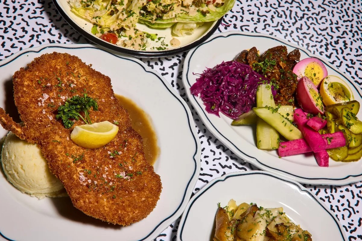 The New Schnitzel House will offer favorites like a housemade pretzel, served with a side of beer cheese, pickled onions, and house mustard ($13); a brat plate with an all-pork frankfurter, smoked kielbasa, Schnitzel House brat, and kraut ($26); a pickle plate with sweet and sour kraut, pickled eggs, bread and butter pickles, pickled mushrooms, and beet turnips ($14); and chicken schnitzel ($26)