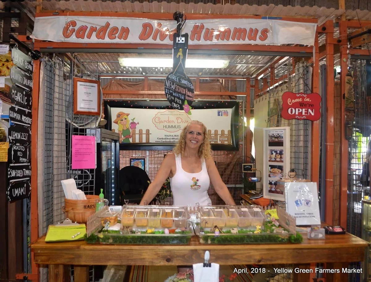 Cherie Mione has turned her love for hummus into its own brand. A dental hygienist by trade, the curly-haired blonde began making hummus through necessity. “I just didn’t like all the chemicals that were in the store-bought brands,” Mione says. Three years ago, she began selling hummus at the market under her brand, Garden Diva. Though she still works in dentistry on the weekdays, she’s at the market every Saturday and Sunday. “I basically have no days off.” She believes it’s important to personally be at the market to answer questions and peddle her wares. After all, hers isn’t the only hummus available. “There’s no exclusivity, so in my aisle, there are two, maybe three other places that sell hummus. I have to be vocal and I have to be the best.” The work has paid off, and her product is now available at a handful of markets in South Florida. The opportunity, she says, came through contacts she met at Yellow Green.