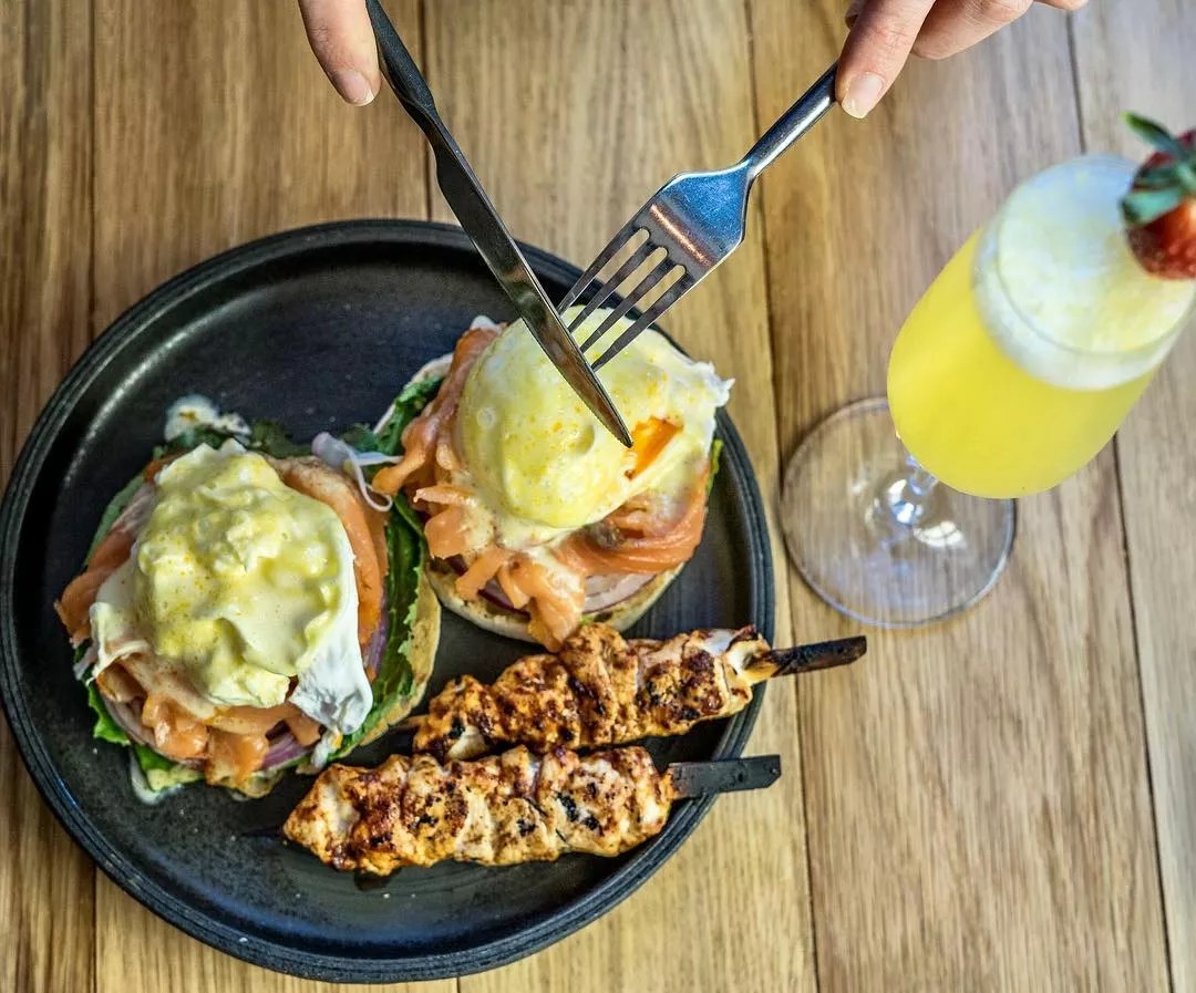 The indoor-outdoor space, which offers a charming tree-canopied patio, allows guests to leisurely dine while diving into a seemingly endless selection of items. Begin with a raw bar stocked with oysters, shrimp, ceviche, and sushi rolls. Move on to warm plates, such as made-to-order omelets filled with glazed filet mignon or pincho de pollo, as well as self-serve taco and ramen stations.