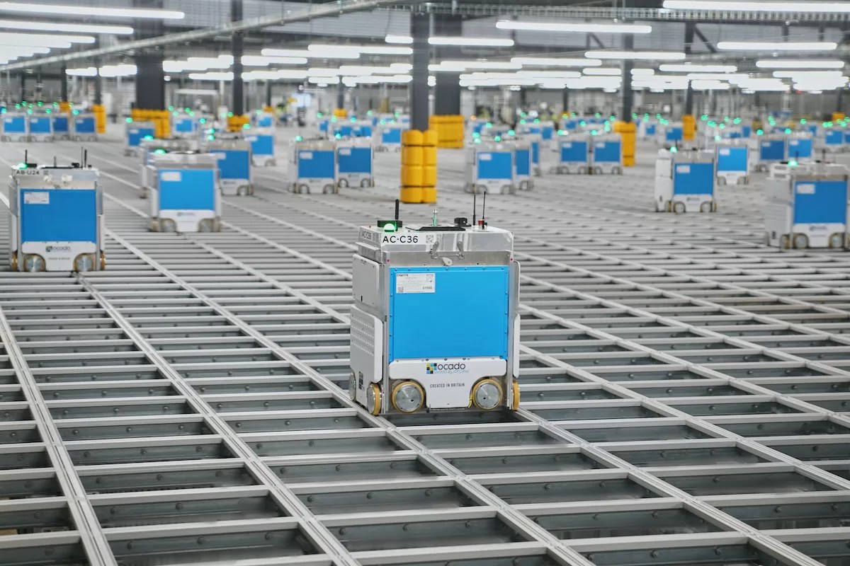 Inside the highly automated centers, more than 1,000 robots will whiz around giant 3D grids, orchestrated by Ocado’s proprietary air-traffic control system. The grid, known as “the Hive,” contains hundreds of totes where products are placed to fill orders.