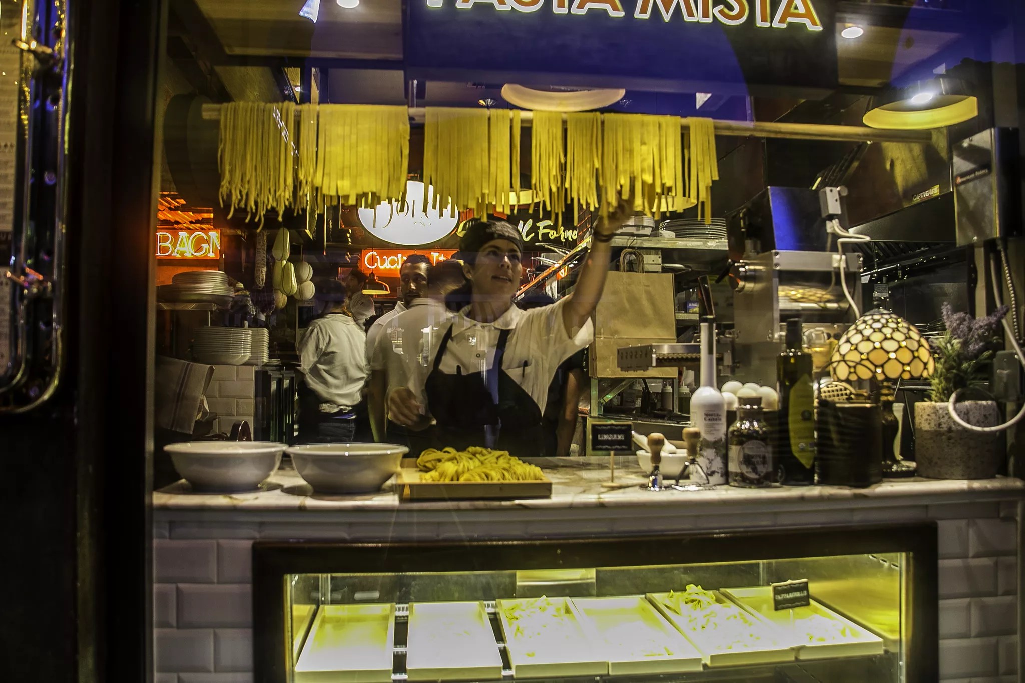 Inside the restaurant, pasta hangs from wooden rods, fresh fish is layered in buckets of ice, and cheese wheels are stacked on shelves just below the ceiling. Creating an atmosphere similar to a European market, booths are centered around a specific concept, including the pescheria (fish market), macelleria (meat market), pasta mista (mixed pasta station), and formaggio (cheese station). There’s also a bar stocked with beer, wine, and Italian-inspired cocktails.