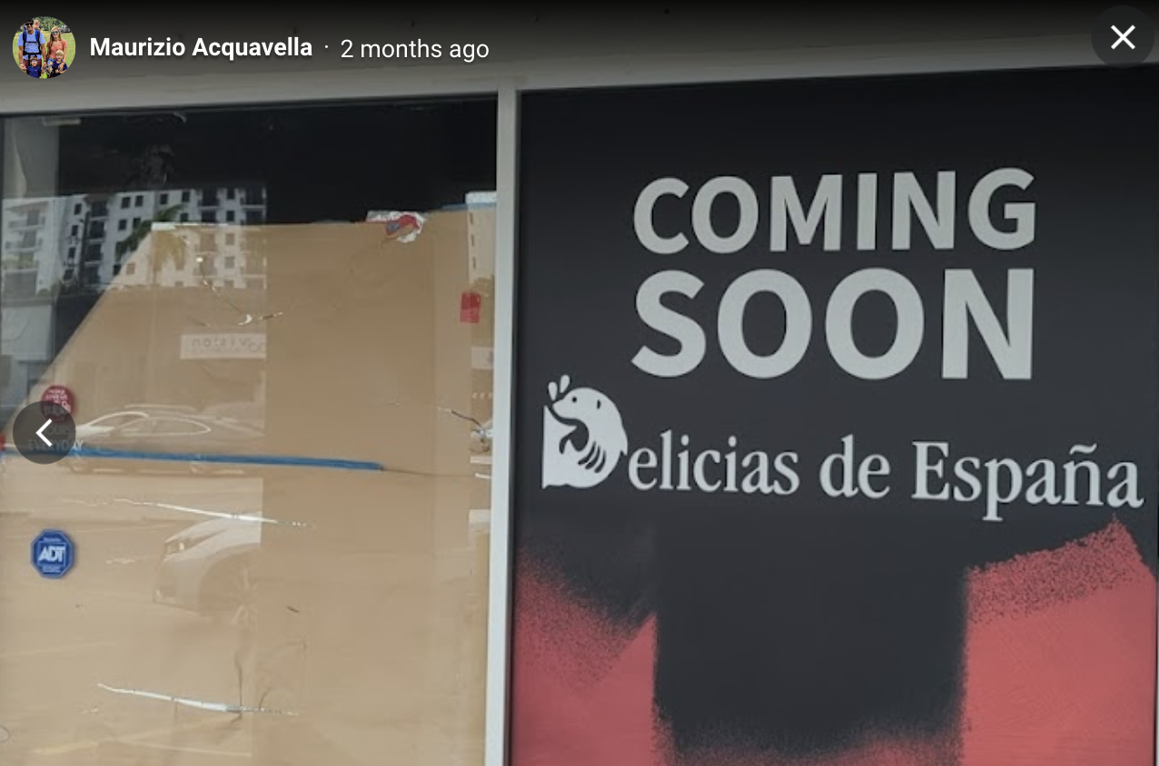 A photo posted to Google shows a “Coming Soon” sign outside of the new Delicias De España in South Miami on Sunset Drive.