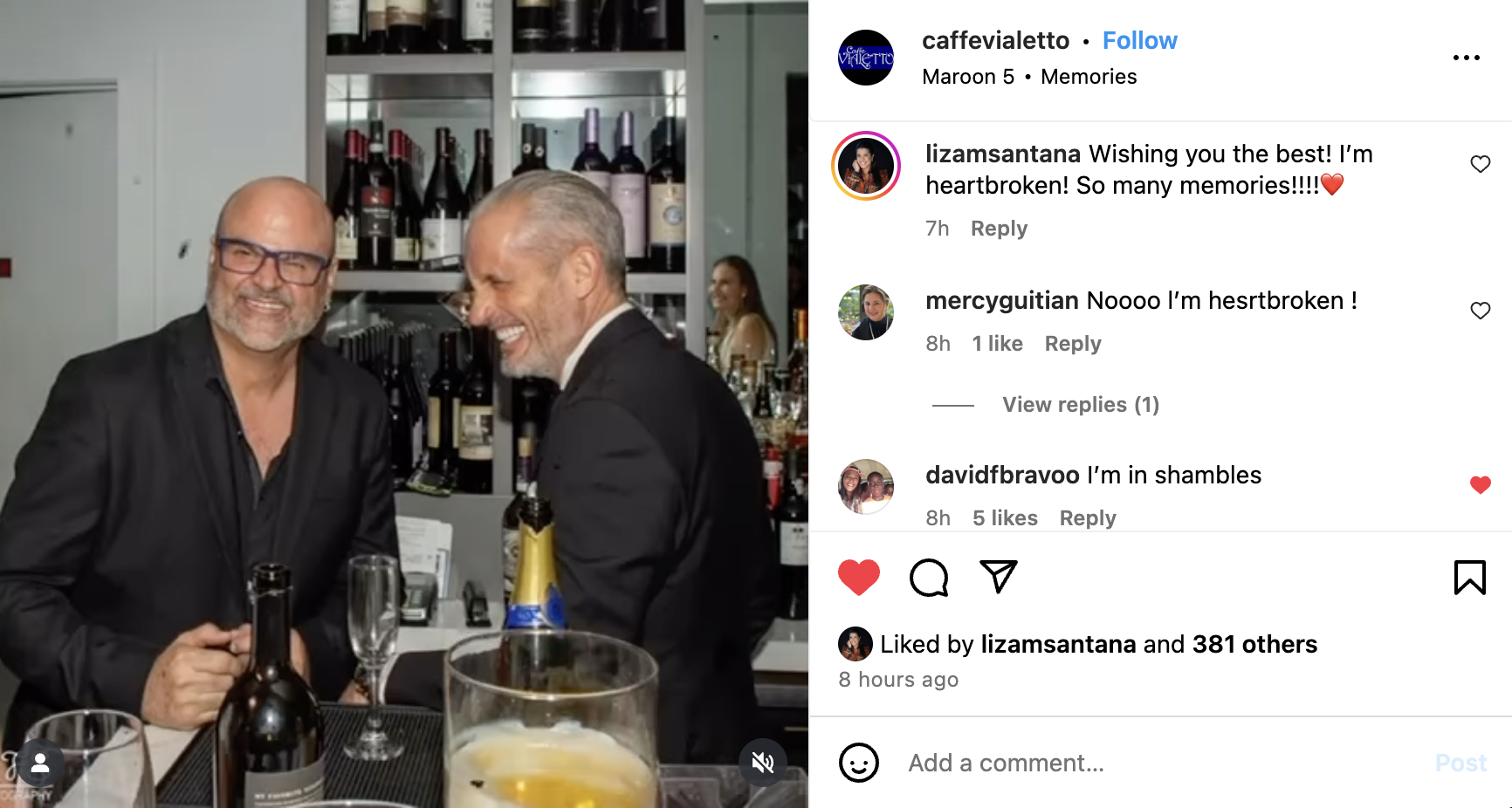 Loyal customers immediately took to the comments of the Instagram post throughout the morning, with some writing, “Wishing you the best! I’m heartbroken! So many memories!” “I’m in shambles,” “There are not many restaurants in Miami that can last and thrive for 26 years…certainly not an easy feat and the two of you did it always with hard work, service forward, and delicious food…my family and I will always be grateful for sitting at your tables and all the memories!”