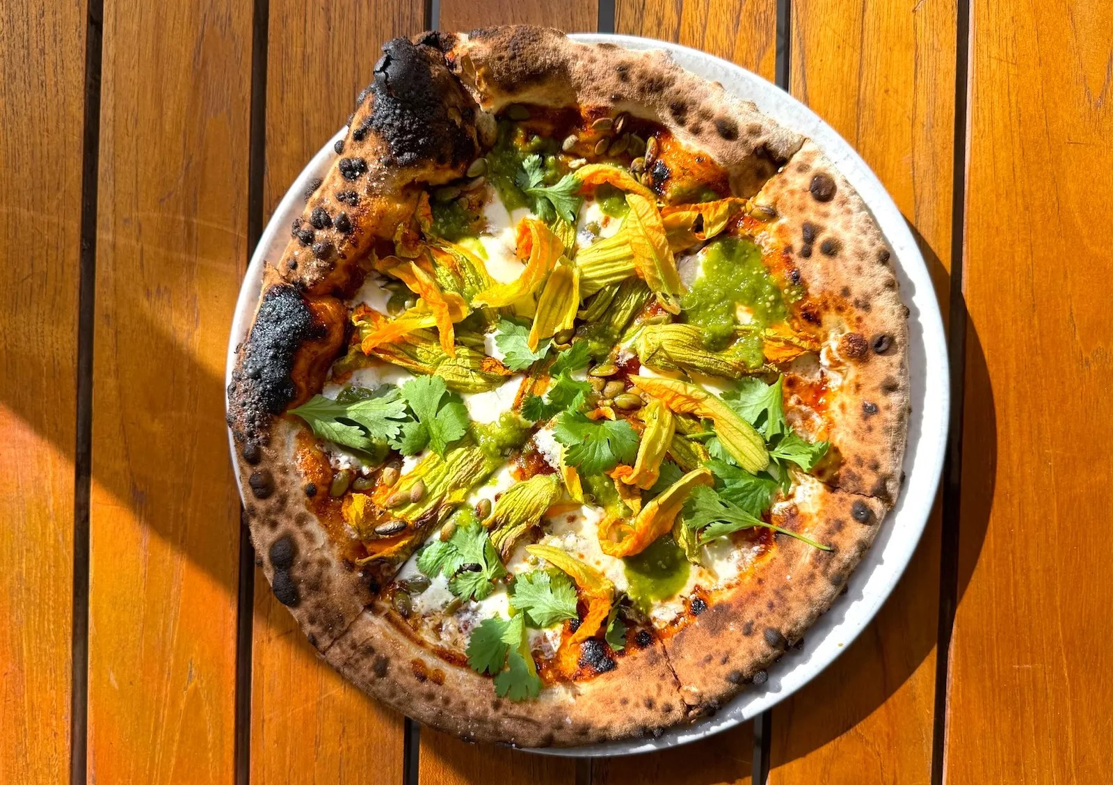 Schwartz says Mexico itself inspired him after visiting Oaxaca, where he immersed himself in the region’s rich food culture, indulging in the local cuisine supplied by the markets and street vendors to restaurants and bodegas. Take the salsa morita, a bright red salsa made with dried morita chile peppers and roasted garlic, served with his white masa tostada. Or the Oaxacan pizza he prepares with a fragrant mole amarillo base, one that pairs beautifully with the squash blossoms, quesillo, salsa, and pumpkin seed toppings.