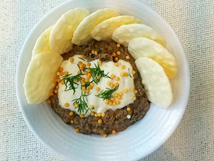 French lentil p’té ($12) is a creamy mix of lentils topped with cashew-dill sour cream and paired with rice crisps.