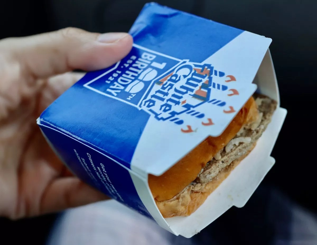 A single crate from the Crave Pallet holds 100 individually boxed White Castle sliders like this one.