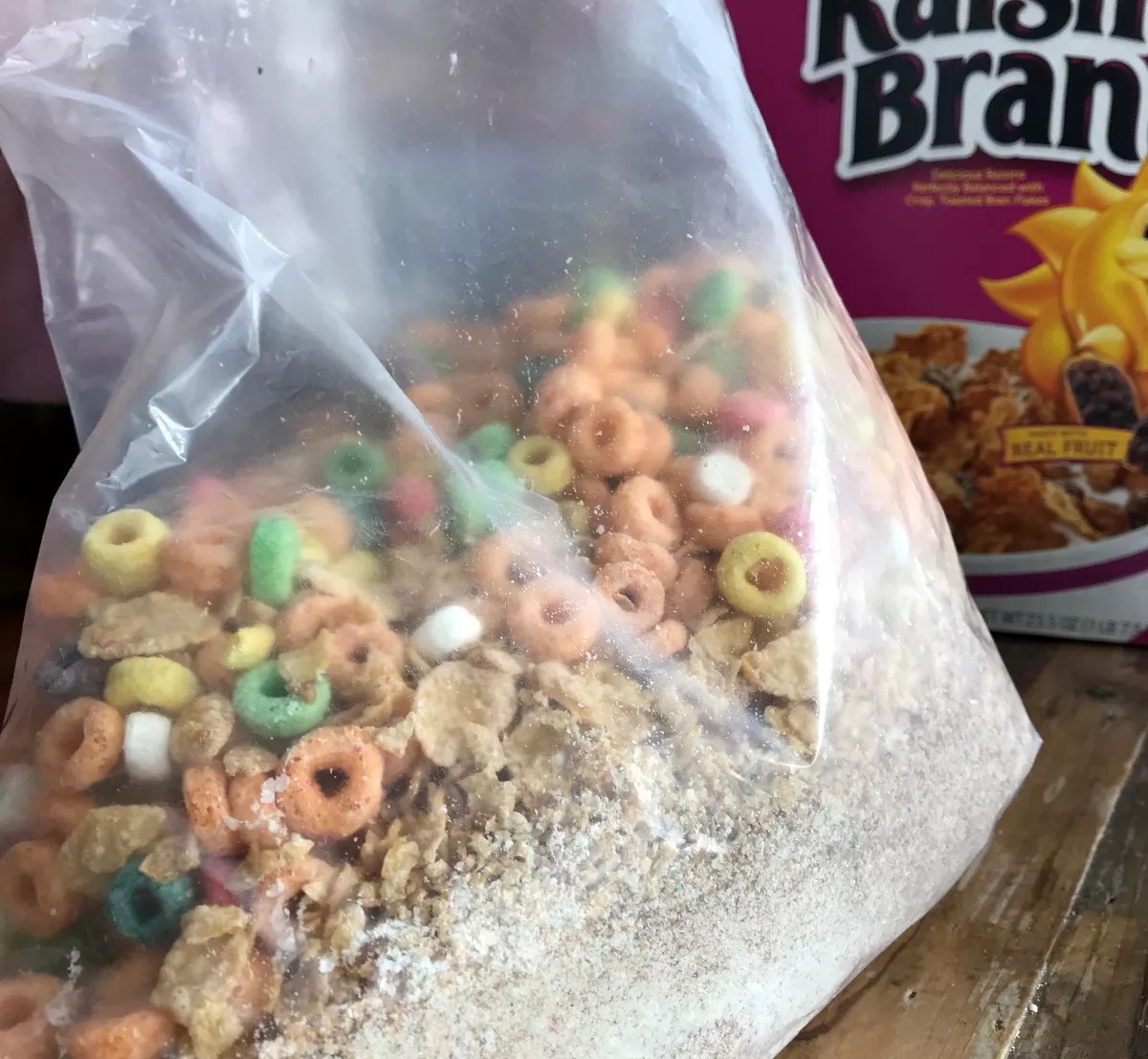 Mystery cereal mixture inside sealed Raisin Bran box.
