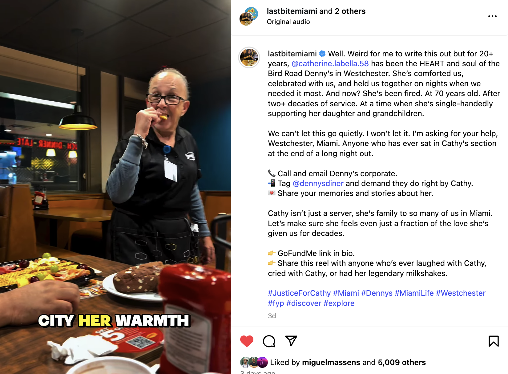 On Saturday, September 6, Mario Avalos, better known by his handle @lastbitemiami, posted an Instagram Reel that may have just changed the life of a deserving woman. In the video, the 33-year-old Miami native begins with the kind of late-night banter you’d expect at a diner booth: “You’re a hero. You’re like Batman. You’re like Wonder Woman, bro. You realize that?” But this wasn’t just a joke. It was the start of a sincere appreciation video to Cathy, the longtime server at the Denny’s on Bird Road and 87th Avenue.