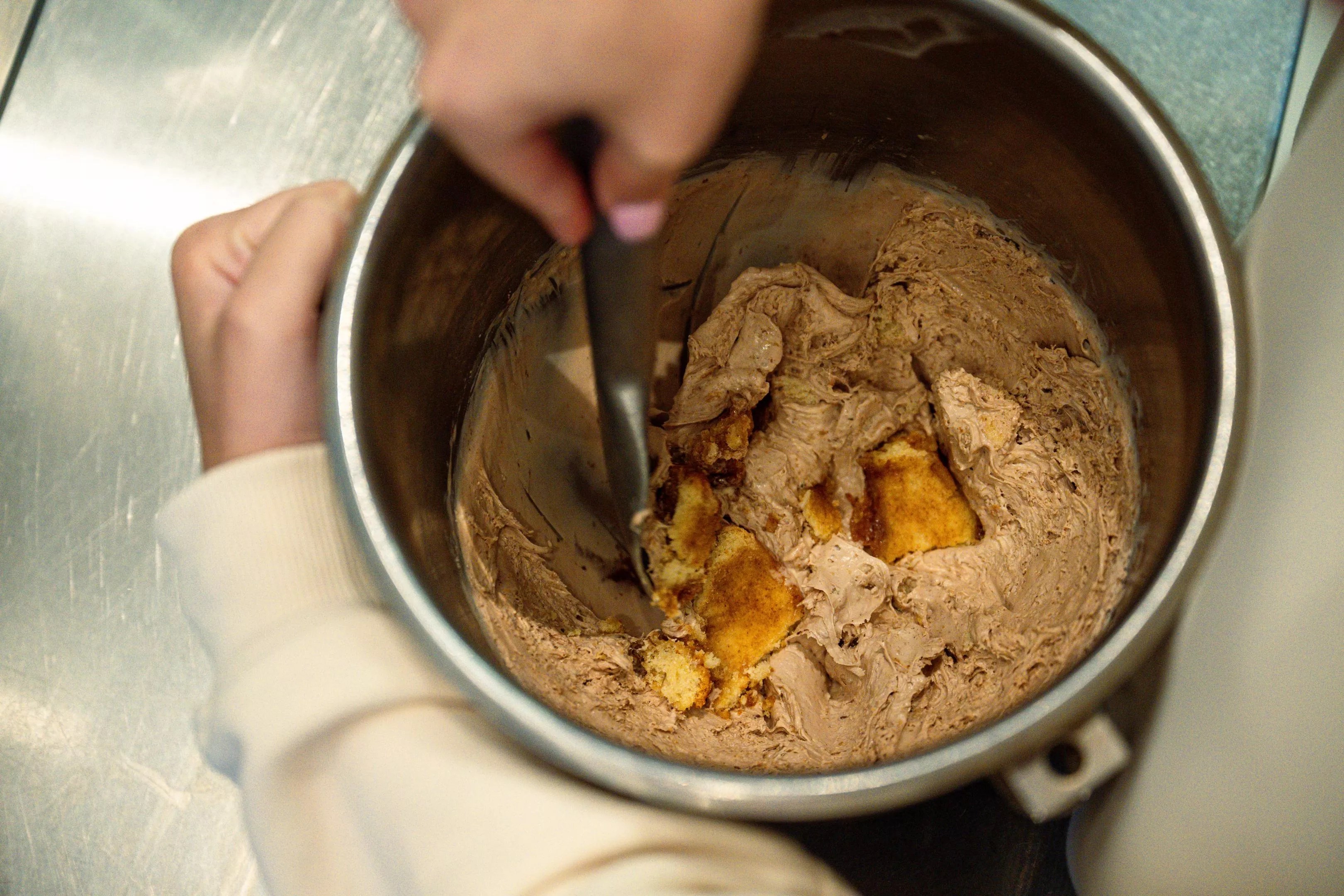The nitrogen ice cream has giant chunks of Knaus Berry Farm cinnamon rolls mixed inside.