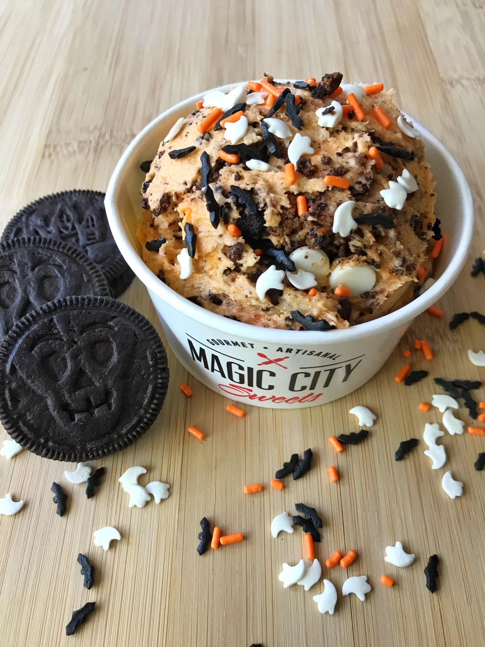 Magic City Sweets. Embrace your inner child with Magic City Sweet’s Cookies and Screams ($7), raw cookie dough enveloped with a hodgepodge of chocolate sandwich cookies, Halloween-themed sprinkles, and white chocolate chips. The best part? Bake your leftovers for the perfect midnight snack. magiccitysweets.com.  Delivery available via Uber Eats