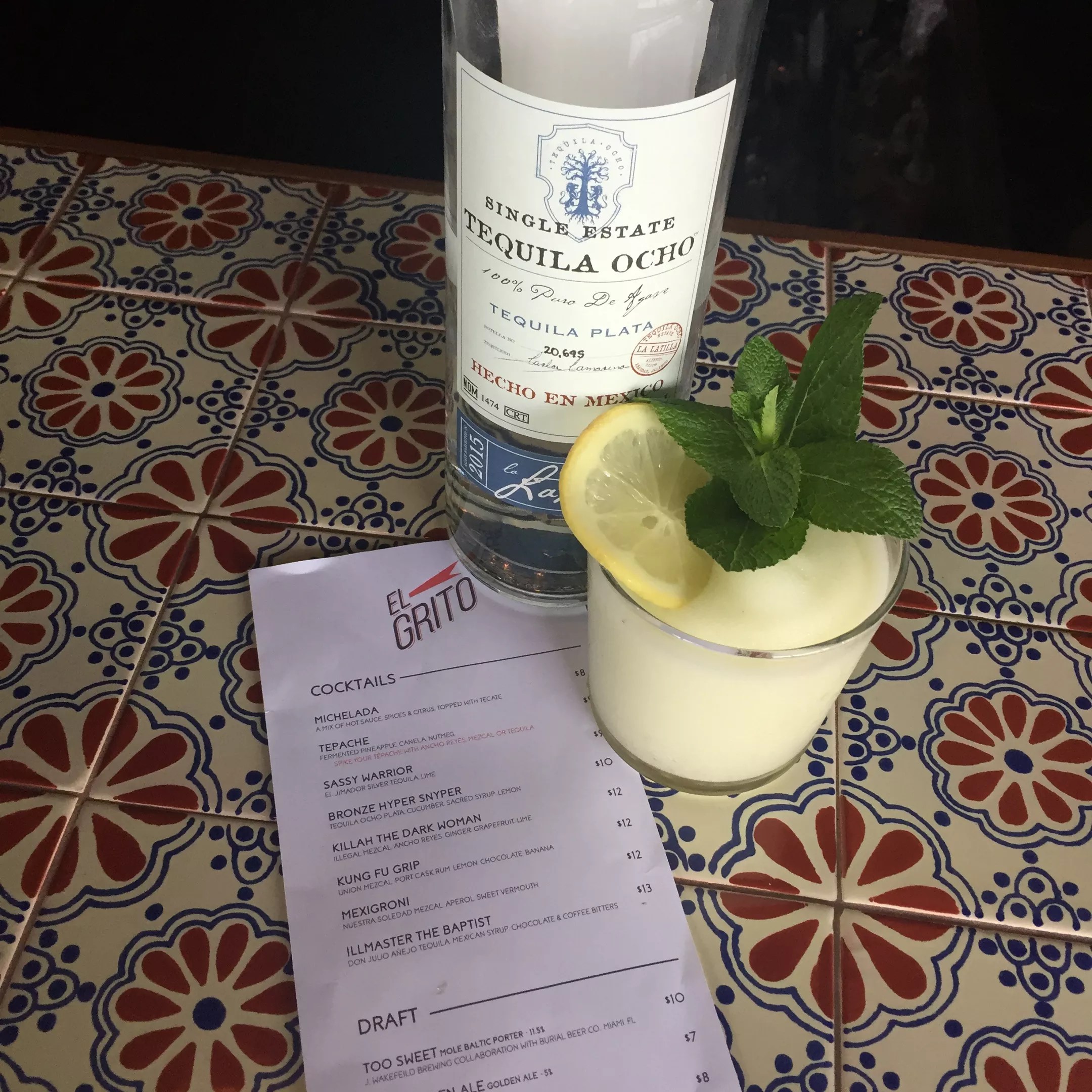 Ezra Pattek, bar manager of El Grito, suggests guests lean toward the Ocho Plata tequila-based drink made with cucumber, lemon, and “sacred” syrup (containing hoja santa leaf and ginger). This cocktail is also offered frozen. “It’s getting hot and humid here in Miami” Pattek says. “What’s better than a frozen tequila cocktail?”