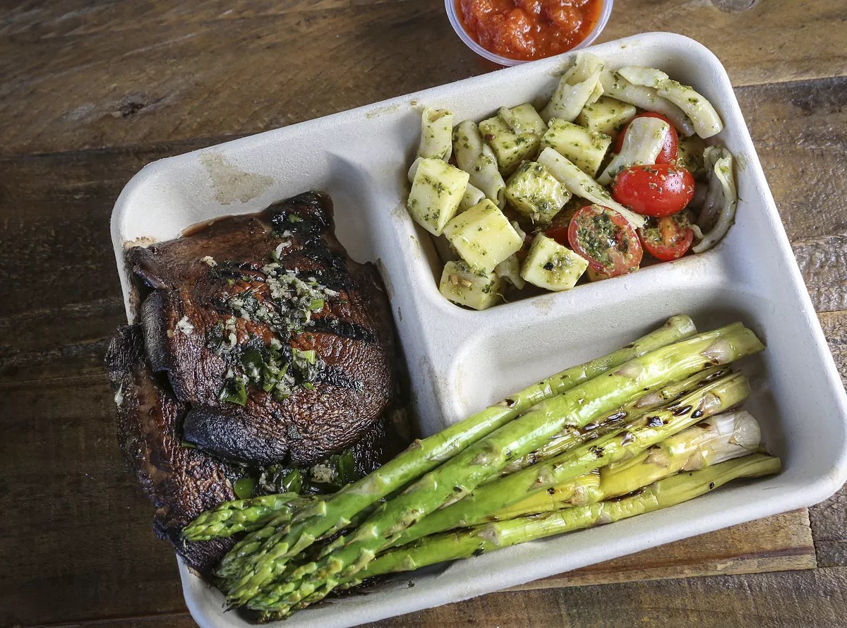 Portobello mushrooms, brussels sprouts, gluten free pasta salad, oven roasted tomato sauce at Grown.