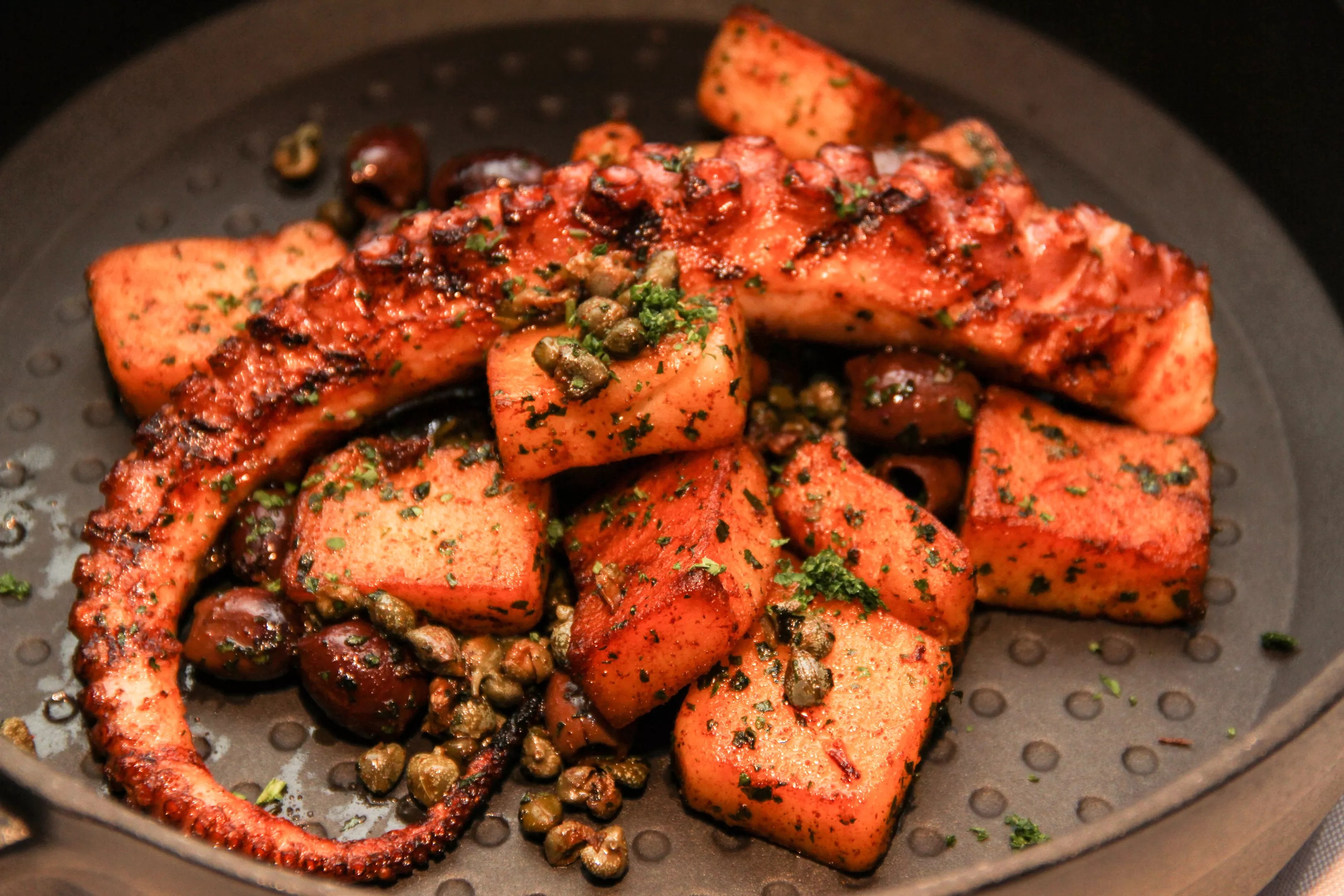 There’s also octopus – al lagareiro pulpo – served in a cast-iron skillet ($27) and a Cajun-spice-crusted beef tenderloin served with pumpkin-Gorgonzola risotto ($37). All appetizers are offered until 4 a.m., including croquettes filled with duck and Serrano ham and garnished with Grana Padano cheese foam ($14) and truffle arancini stuffed with Gouda infused with truffle and saffron ($10).