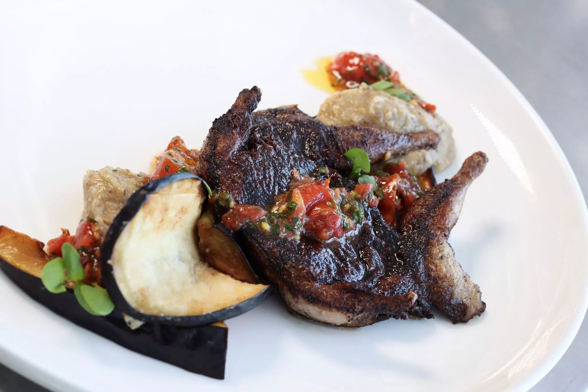 The entrée – blackened quail and smoked eggplant with blistered cherry tomatoes – represents Khedoori’s reoccurring use of charcoal.
