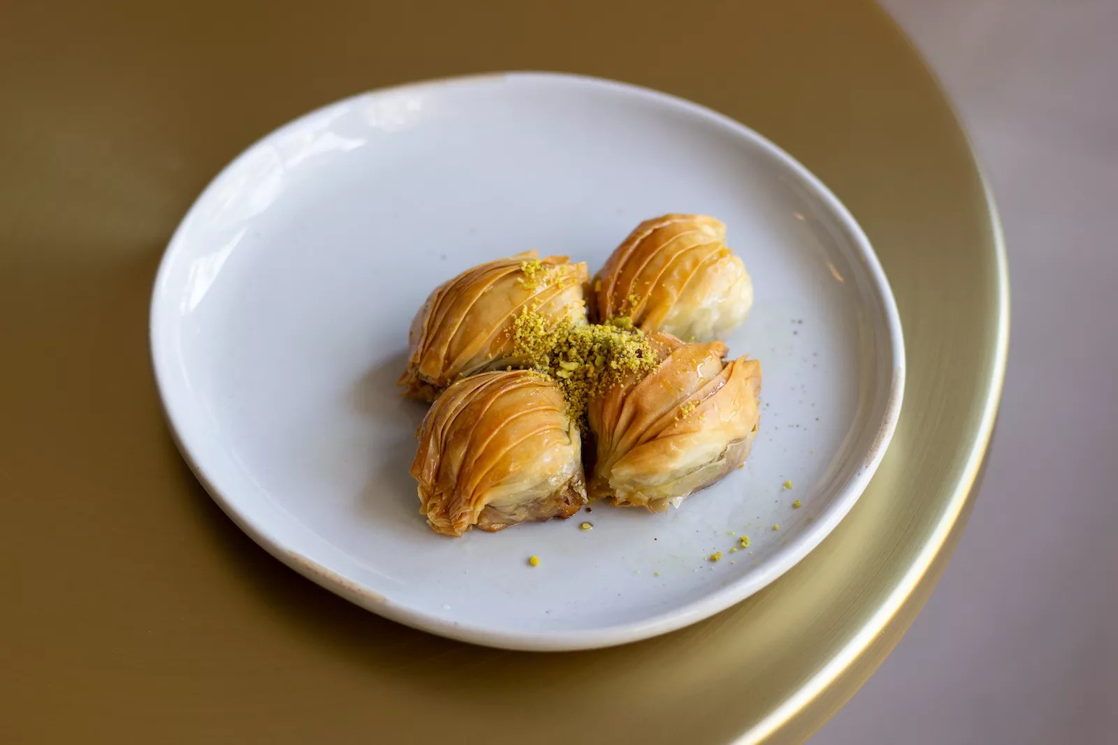 The “seashell” pistachio baklava dessert at Eva and the Oyster Bar in Coconut Grove.