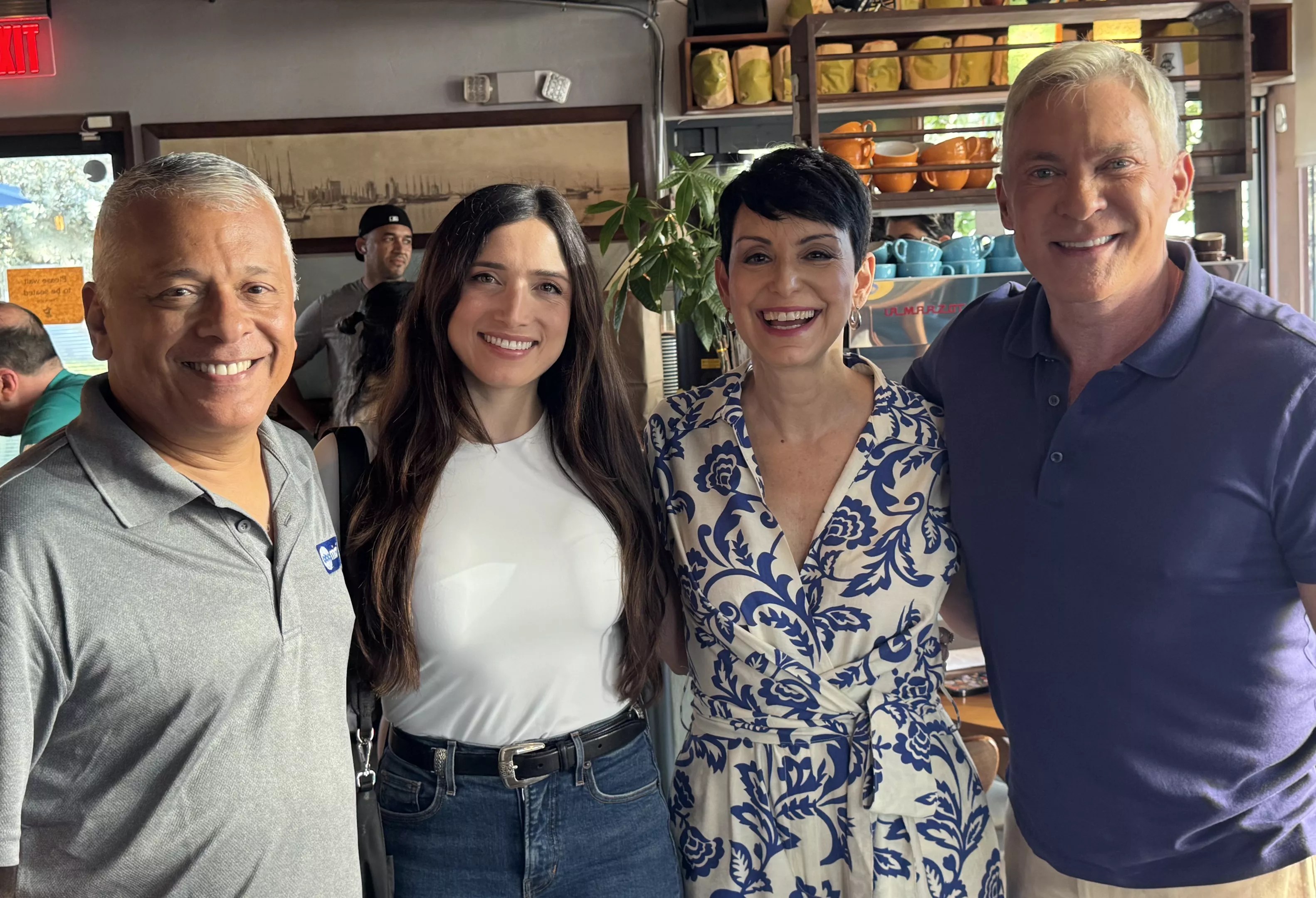 From left: Good Morning America’s Sam Champion visits local business Tinta y Café in Coral Gables with WSVN and ABC Miami 18’s Belkys Nerey and Craig Stevens