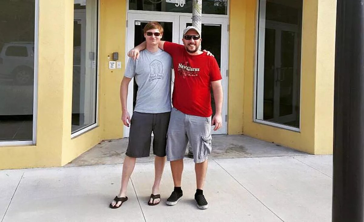 Odd Breed Wild Ales brewer and cofounder Matt Manthe (left) and cofounder Daniel Naumko stand outside their Pompano Beach facility.