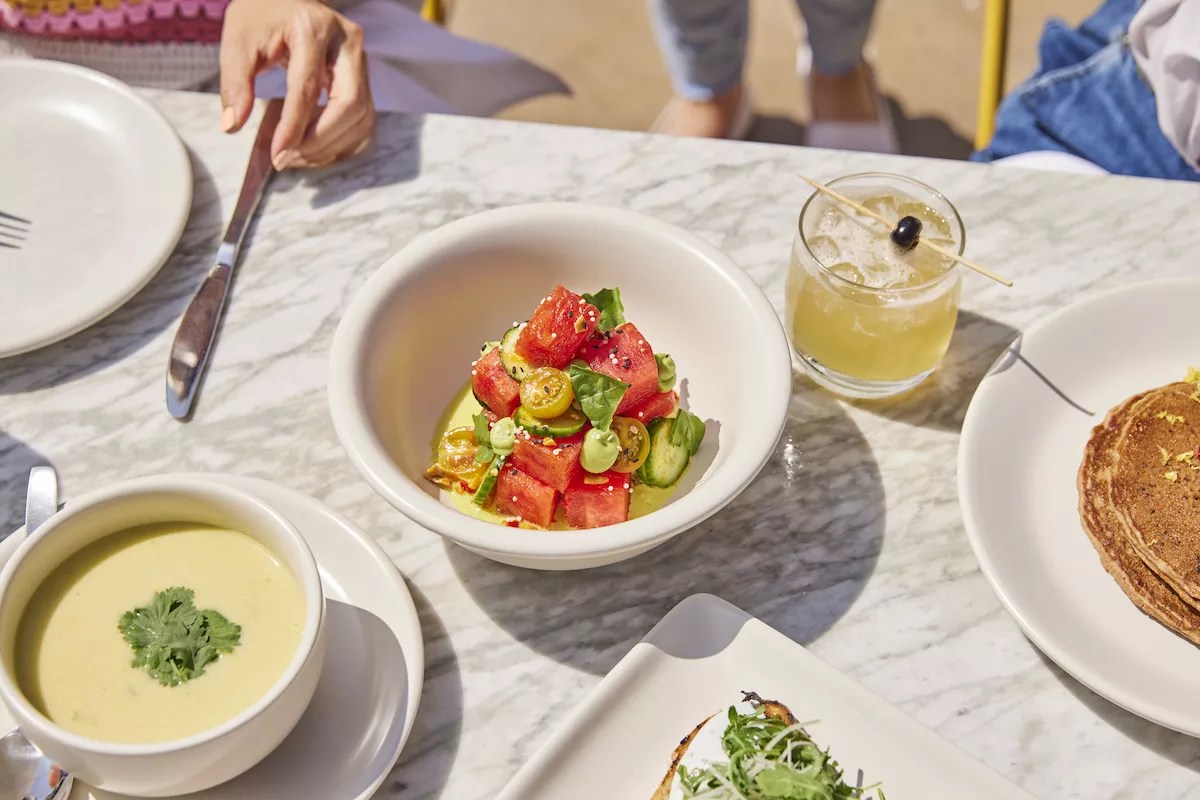 The Miami location includes an open kitchen so diners can watch as their dishes are concocted, a green goddess-inspired mural by local artist Cinthia Santos, and seating for nearly 400. Environmentally friendly materials were used in its construction, from the chairs made from recycled soda bottles to indoor/outdoor gardens where fresh herbs are grown.