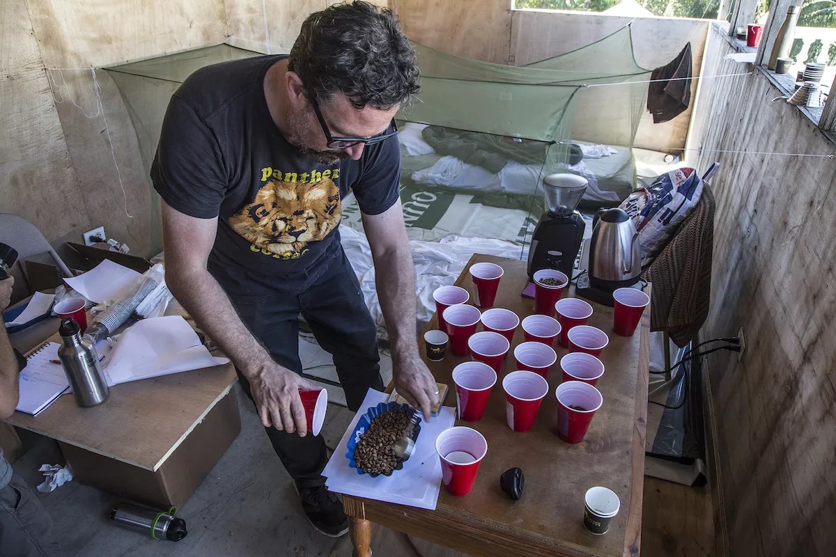 Panther Coffee’s Joel Pollock cups coffee beans in Haiti.