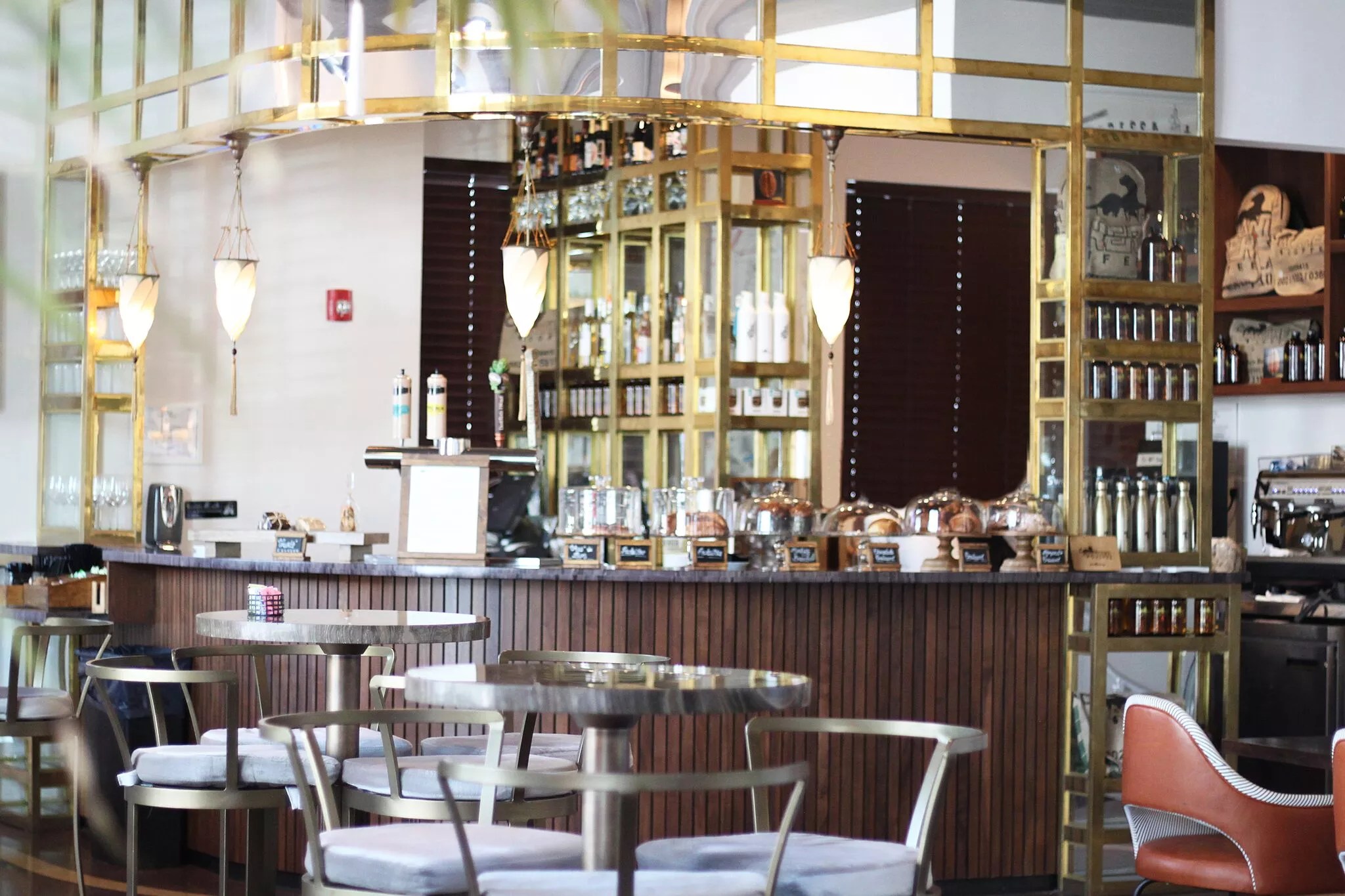 With a wooden and granite coffee bar at the center, the space is designed with gold, silver, and copper hues, creating a warm and welcoming atmosphere. As at the former Conservatory, various tables and cozy chairs are scattered about. Customers are welcome to visit the shop for a quick breakfast or afternoon coffee or even use it as a temporary workspace. Wi-Fi is complimentary.
