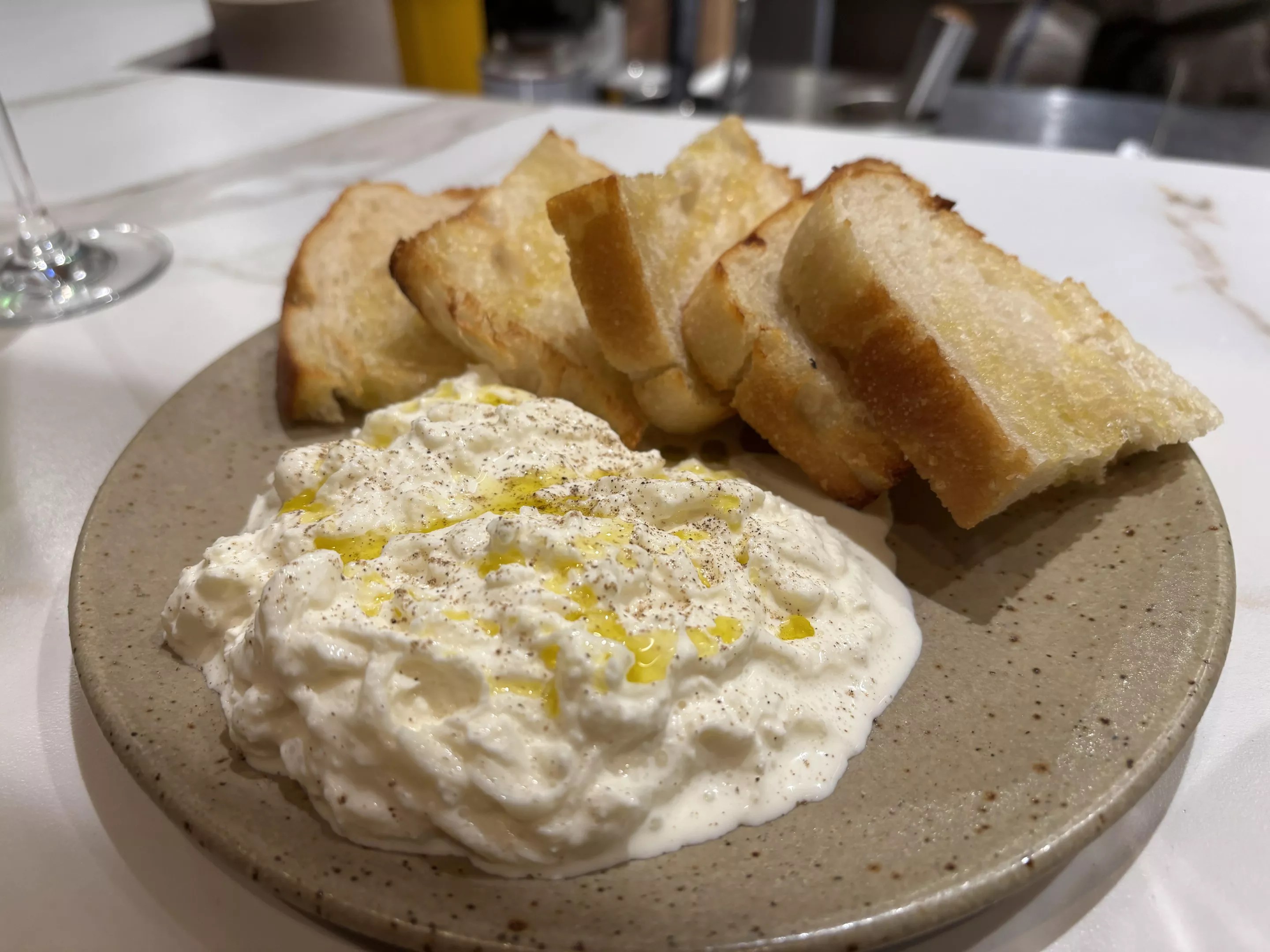 The stracciatella is a highlight, creamy and barely salted with a hint of olive oil and black pepper, served alongside pillowy, olive-oil-toasted sourdough.