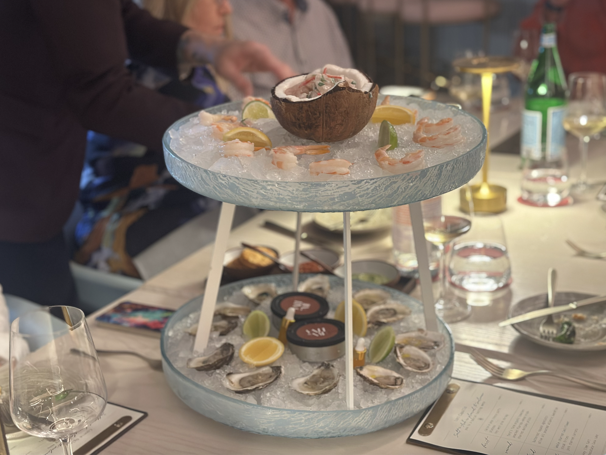 A seafood plateau combines lavender-smoked oysters, Key West shrimp, coconut tuna ceviche, marinated clams, and ghee old bay crackers across two tiers. While seafood towers have become standard luxury restaurant fare nowadays, this one differentiates itself through house-made sauces – particularly the bright, herbaceous dilly green sauce that outshines traditional sauces.