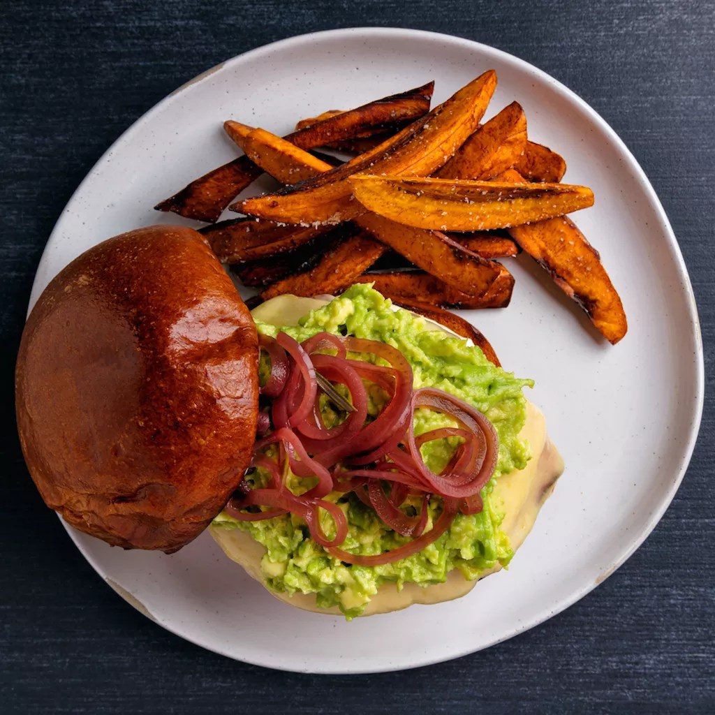 Entrée highlights include grilled chimichurri baby chicken with jasmine rice sautéed with fried plantain, pineapple, coconut, and fermented soybeans ($26); pork Milanese with tomato, avocado, radishes, cilantro, and jalapeño ($20); and “the Burger,” served with ham and Swiss cheese, avocado, pickled shallots, cumin mayo, and plantain fries ($15).