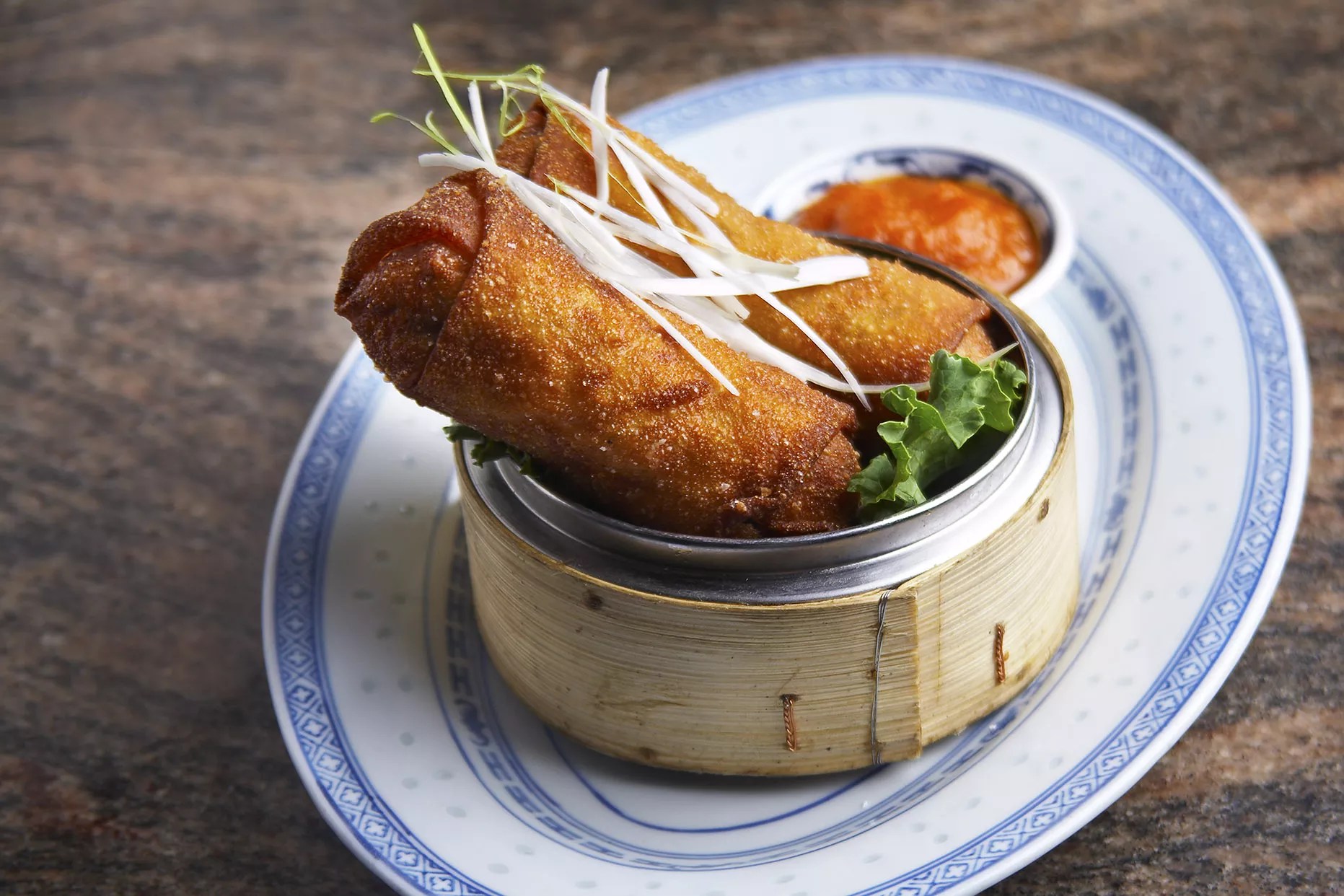 Local farm vegetable egg roll with hot mustard and sweet-and-sour sauce.