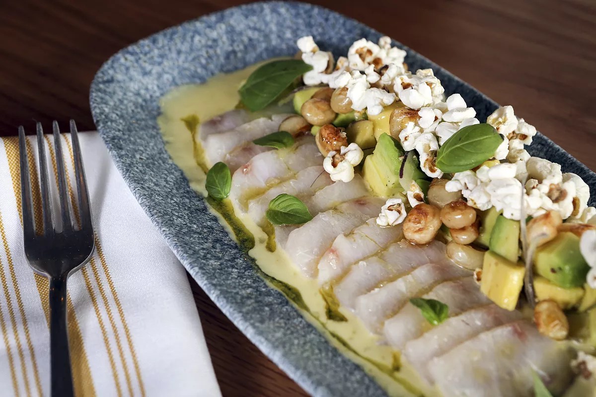 Another notable small plate is the cobia tiradito ($15), which includes thick slices of raw fish layered atop a puddle of lime-green ají amarillo and ginger. Cubed avocado and onion are mixed with hominy and popped corn. Though the popcorn seemed stale, the cobia was impeccably fresh.