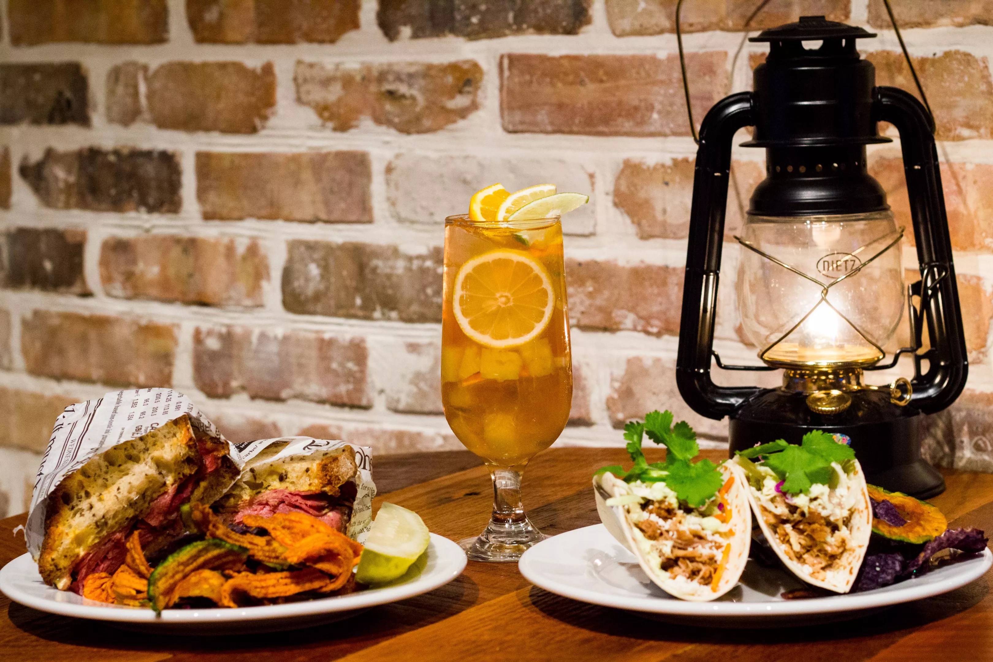 Superbowl Sangria flanked by South Pointe Tavern’s famous Pastrami Reuben sandwich and tacos.