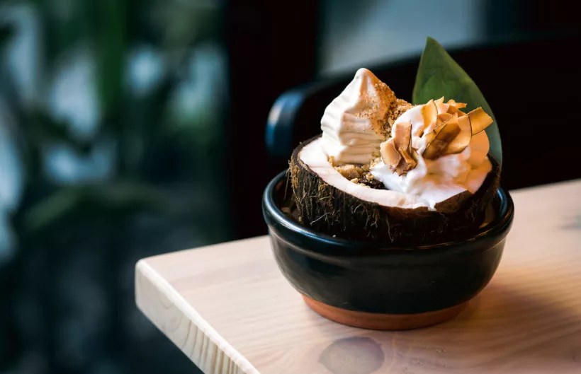 Pubbelly Sushi’s Coco Loco ($11) celebrates Miami’s year-round tropical climate. The brainchild of pastry chef Maria Orantes, this light and refreshing dessert is made of coconut ice cream, coconut mousse, compressed pineapple, brown butter streusel, white chocolate blondie chunks, and candied coconut chips. Plus, it’s served inside an actual coconut.